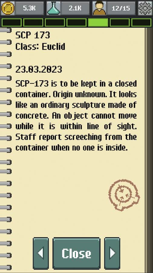 Приветствую! В игре SCP Foundation: Idle Manager вы окунетесь в культовую вселенную и получите возможность управлять новой базой Dash. Игра выполнена в пиксельной графике и имеет классическую вертикальную архитектуру "tap симуляторов". Ваша задача - развивать базу систематически и без задержек, нанимать сотрудников, находить и размещать объекты в камерах, обеспечивать их безопасность и заниматься исследованиями и открытиями. Ведь рано или поздно, ваш персонал столкнется с серьезной проблемой, которая потребует радикальных и болезненных решений. Приготовьтесь к различным инцидентам и сделайте все возможное, чтобы сохранить свою базу и персонал в безопасности.