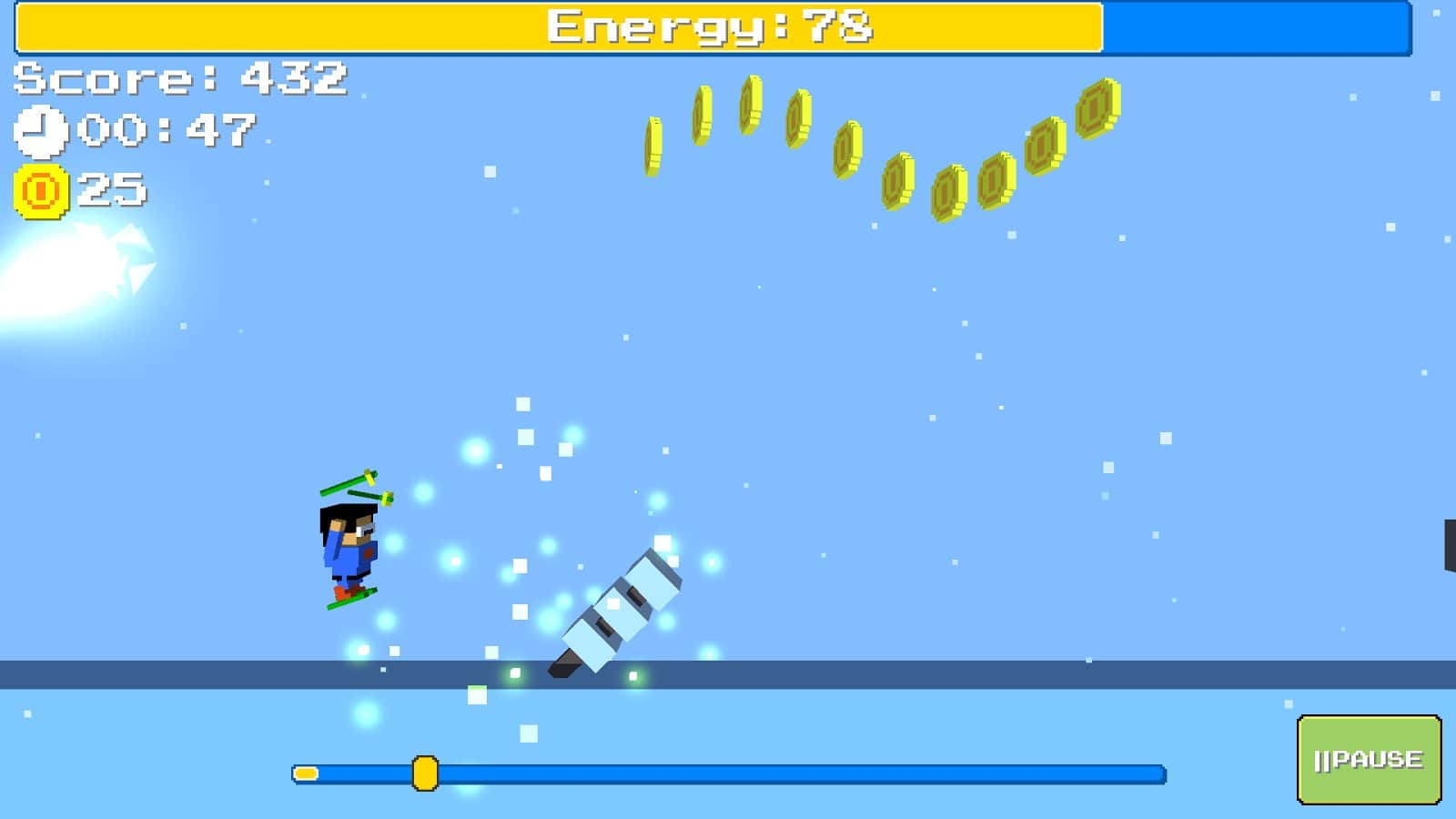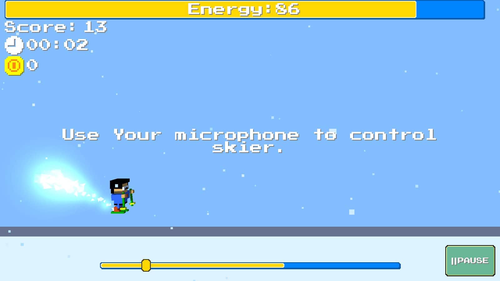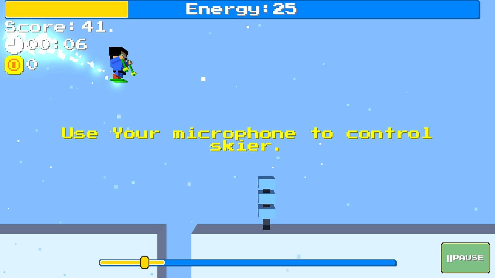 SCREAMY SKI – захватывающая аркада на андроид, которая напомнит вам 8-битные консольные игры. В этой игре вашей задачей будет управлять своим героем и помогать ему перепрыгивать пропасти и собирать монетки. Главная уникальная особенность этой игры заключается в том, что вы будете управлять героем с помощью своего голоса, используя его в нужный момент. Управляйте героем который будет двигаться вперед и применяйте голос для того чтобы он совершал прыжки и приземлялся на специальные платформы. Тратьте энергию на прохождение игры и пополняйте ее с помощью сбора монет. Игра отлично подойдет для любого возраста.