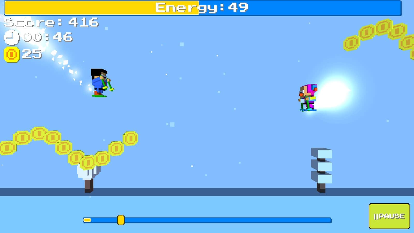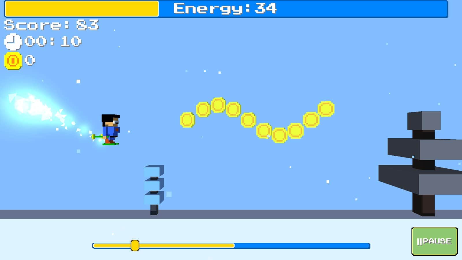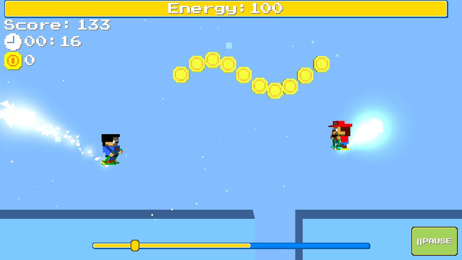 SCREAMY SKI – захватывающая аркада на андроид, которая напомнит вам 8-битные консольные игры. В этой игре вашей задачей будет управлять своим героем и помогать ему перепрыгивать пропасти и собирать монетки. Главная уникальная особенность этой игры заключается в том, что вы будете управлять героем с помощью своего голоса, используя его в нужный момент. Управляйте героем который будет двигаться вперед и применяйте голос для того чтобы он совершал прыжки и приземлялся на специальные платформы. Тратьте энергию на прохождение игры и пополняйте ее с помощью сбора монет. Игра отлично подойдет для любого возраста.
