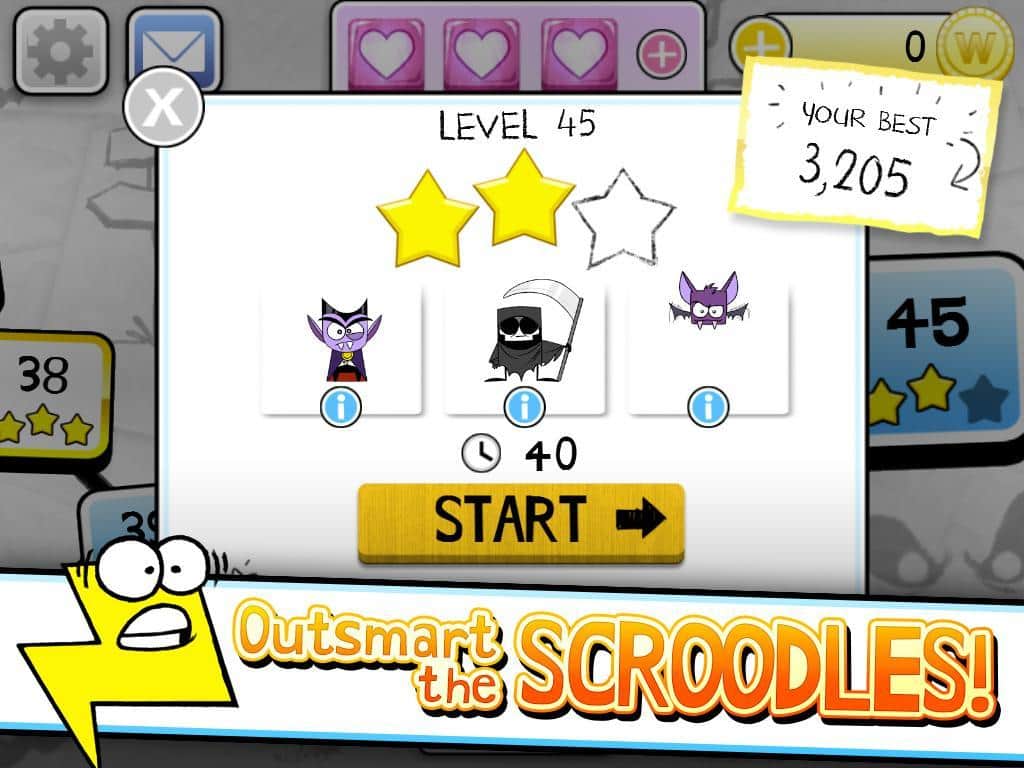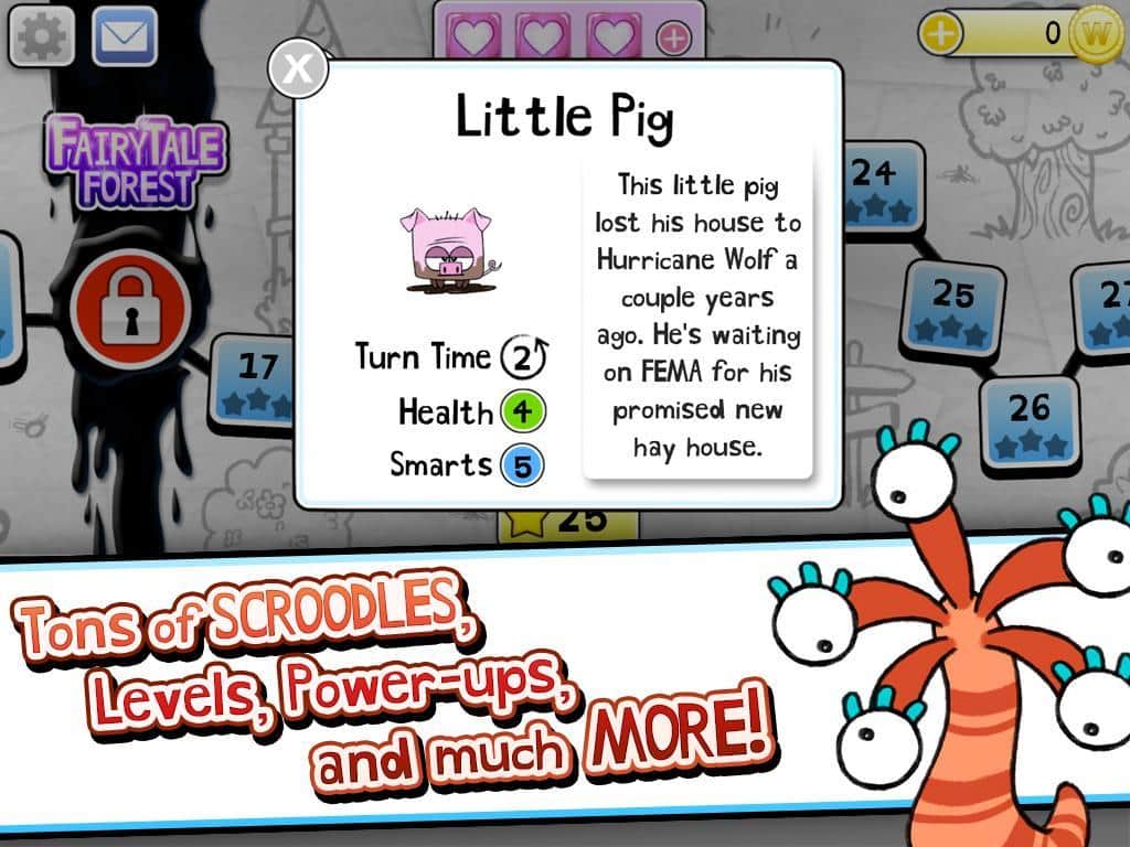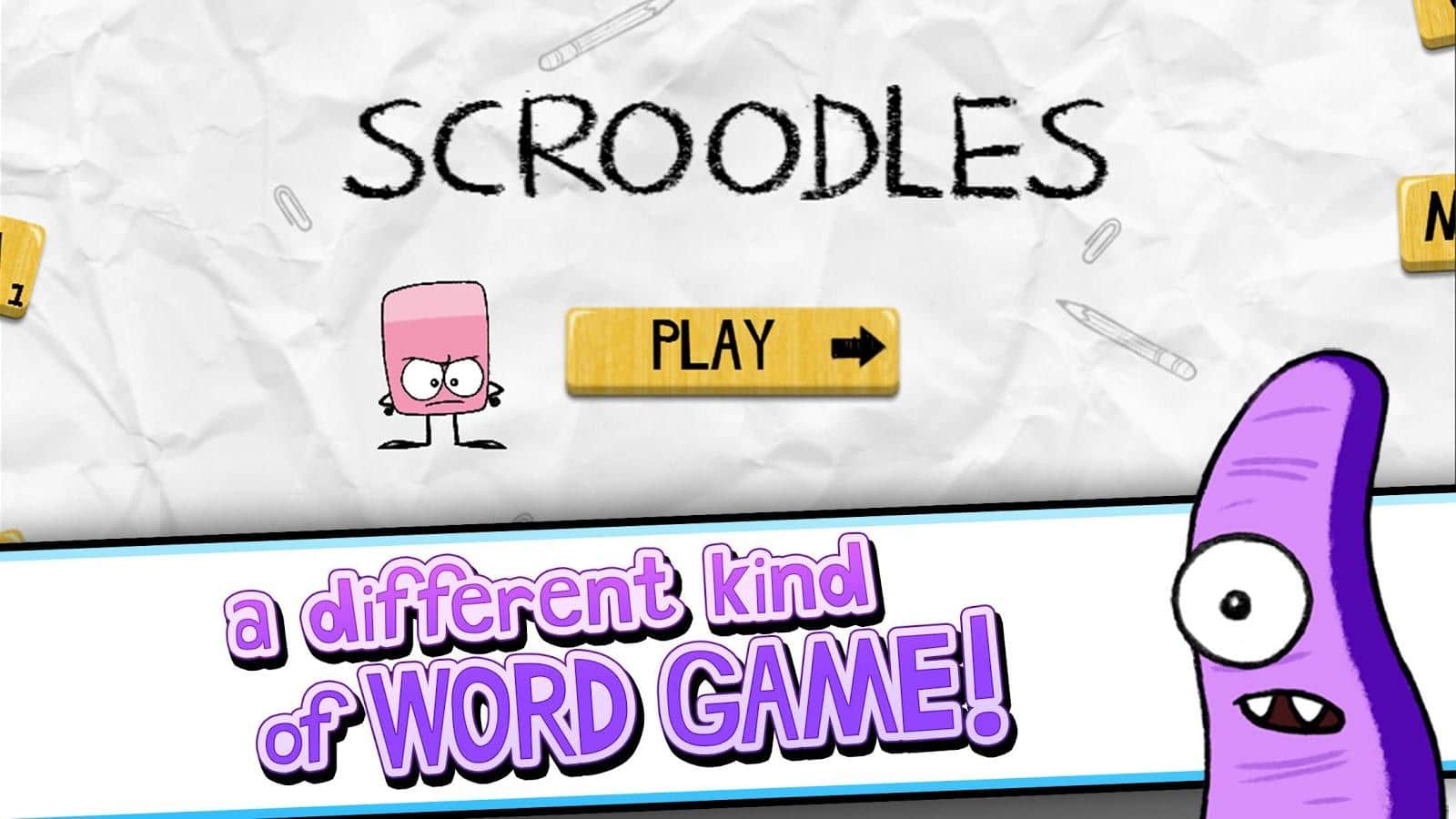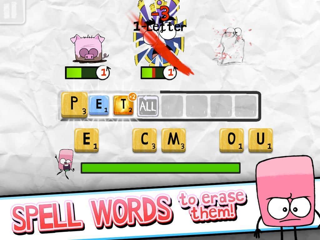 Scroodles - битва слов, возьмите под свой контроль ластик и делайте всё возможное для того, чтобы победить группу озорных рисунков. Хоть и игра связана со словами, в ней можно встретить отличных весёлых персонажей. Каждый персонаж отлично анимирован и прорисован. Уникальные противники имеют свои жизненные характеристики интеллект и скорость. Некоторых победить будет не просто. Случайным образом генерируемые бонусы добавят в игру ещё больше азарта. Соревнуйтесь с друзьями и станьте лучшим игроком. Игра интегрирована с социальной сетью Facebook? Можете похвастаться друзьям о своих достижениях.