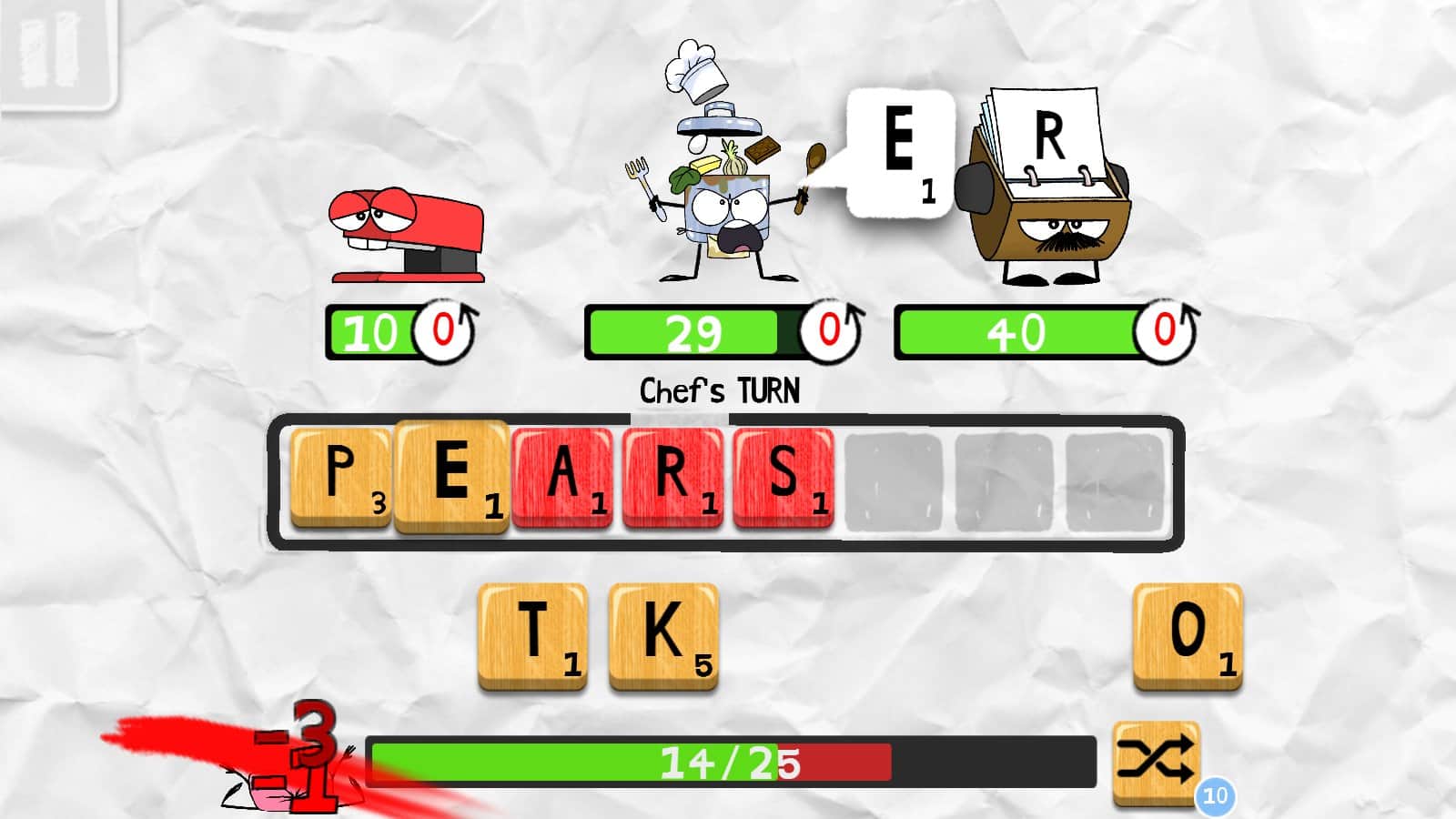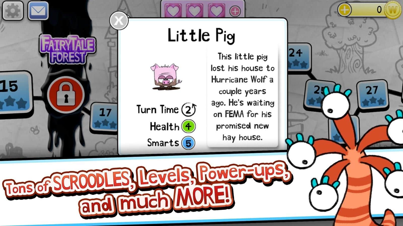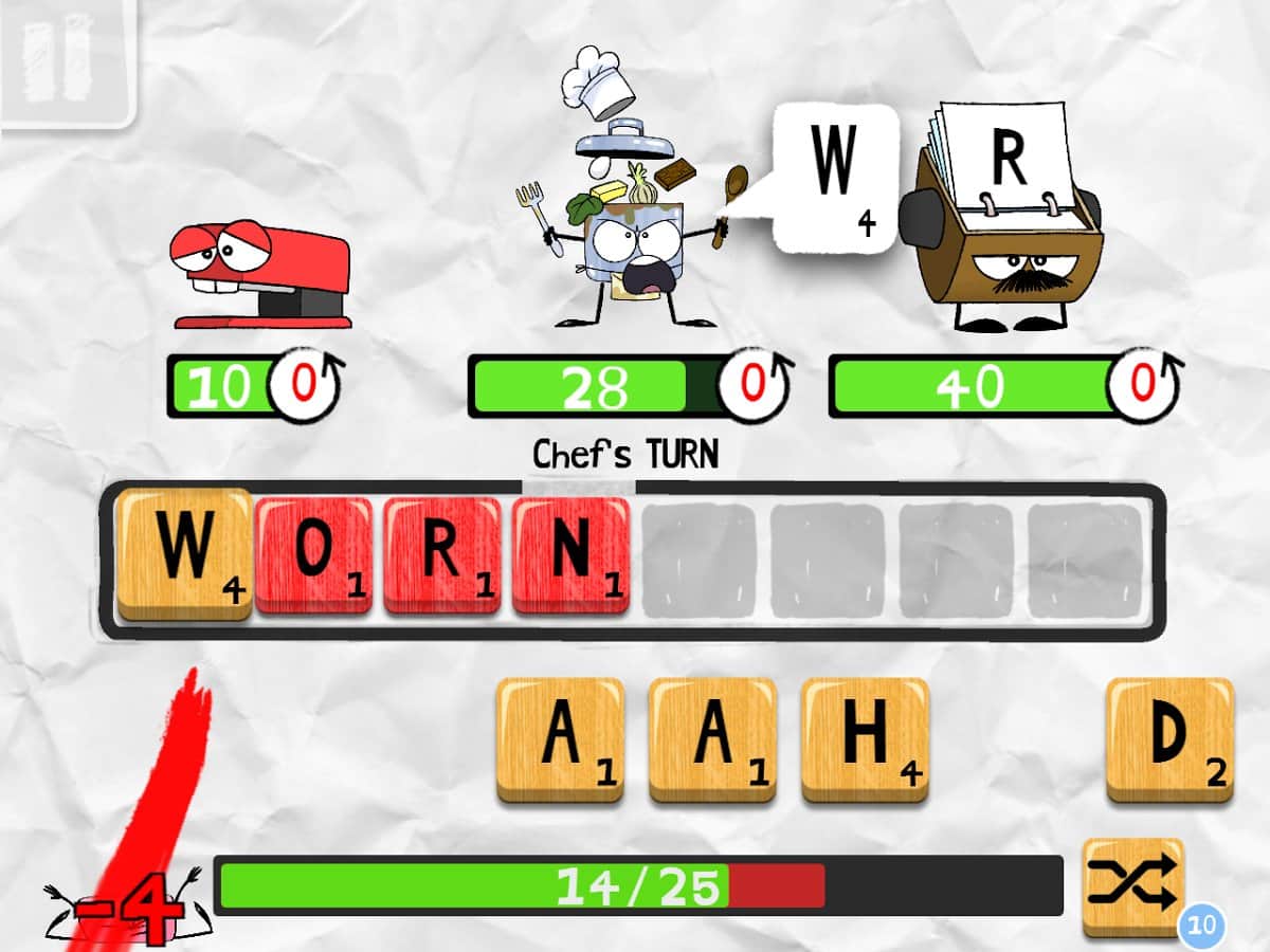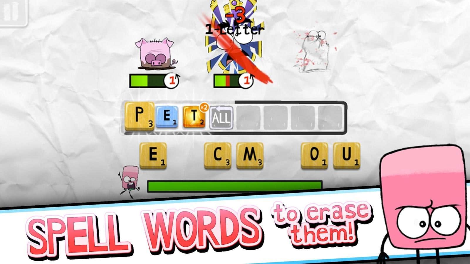 Scroodles - битва слов, возьмите под свой контроль ластик и делайте всё возможное для того, чтобы победить группу озорных рисунков. Хоть и игра связана со словами, в ней можно встретить отличных весёлых персонажей. Каждый персонаж отлично анимирован и прорисован. Уникальные противники имеют свои жизненные характеристики интеллект и скорость. Некоторых победить будет не просто. Случайным образом генерируемые бонусы добавят в игру ещё больше азарта. Соревнуйтесь с друзьями и станьте лучшим игроком. Игра интегрирована с социальной сетью Facebook? Можете похвастаться друзьям о своих достижениях.