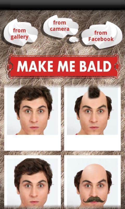 Сделай меня лысым - Это простое приложение, поможет вам приколоться над друзьями, и поиздеваться над их фотографиями. Это обычный фоторедактор, но есть в нем одна любопытная особенность, с помощью него вы сможете побрить себя или своих друзей на лысо! А ещё добавить им усы. Так же, используя свой палец в качестве бритвы, вы сможете сделать им смешные прически. При этом фото вы можете сделать прямо из приложения, или загрузить готовое, или подключится к facebook, и брать фотографии прямо оттуда. Оно было создано исключительно ради веселья, ну либо что бы посмотреть каким вы будете, если облысеете.