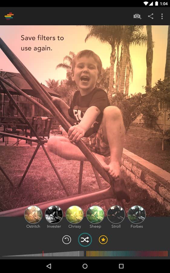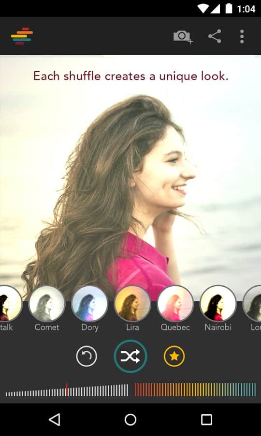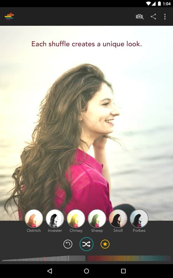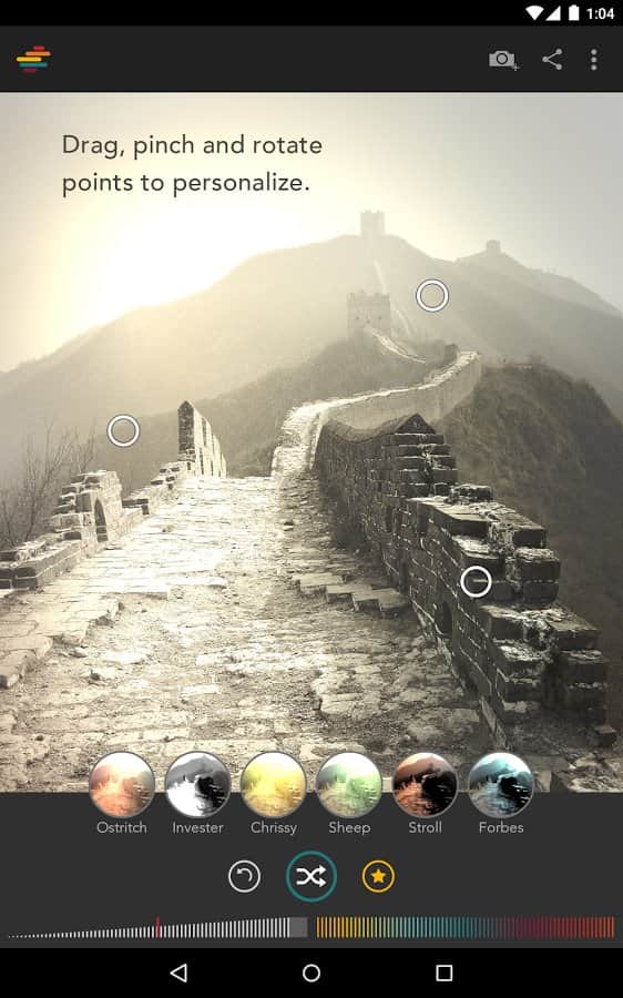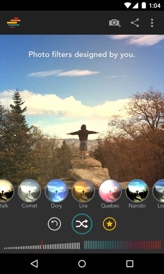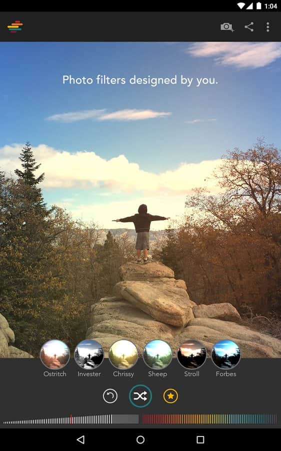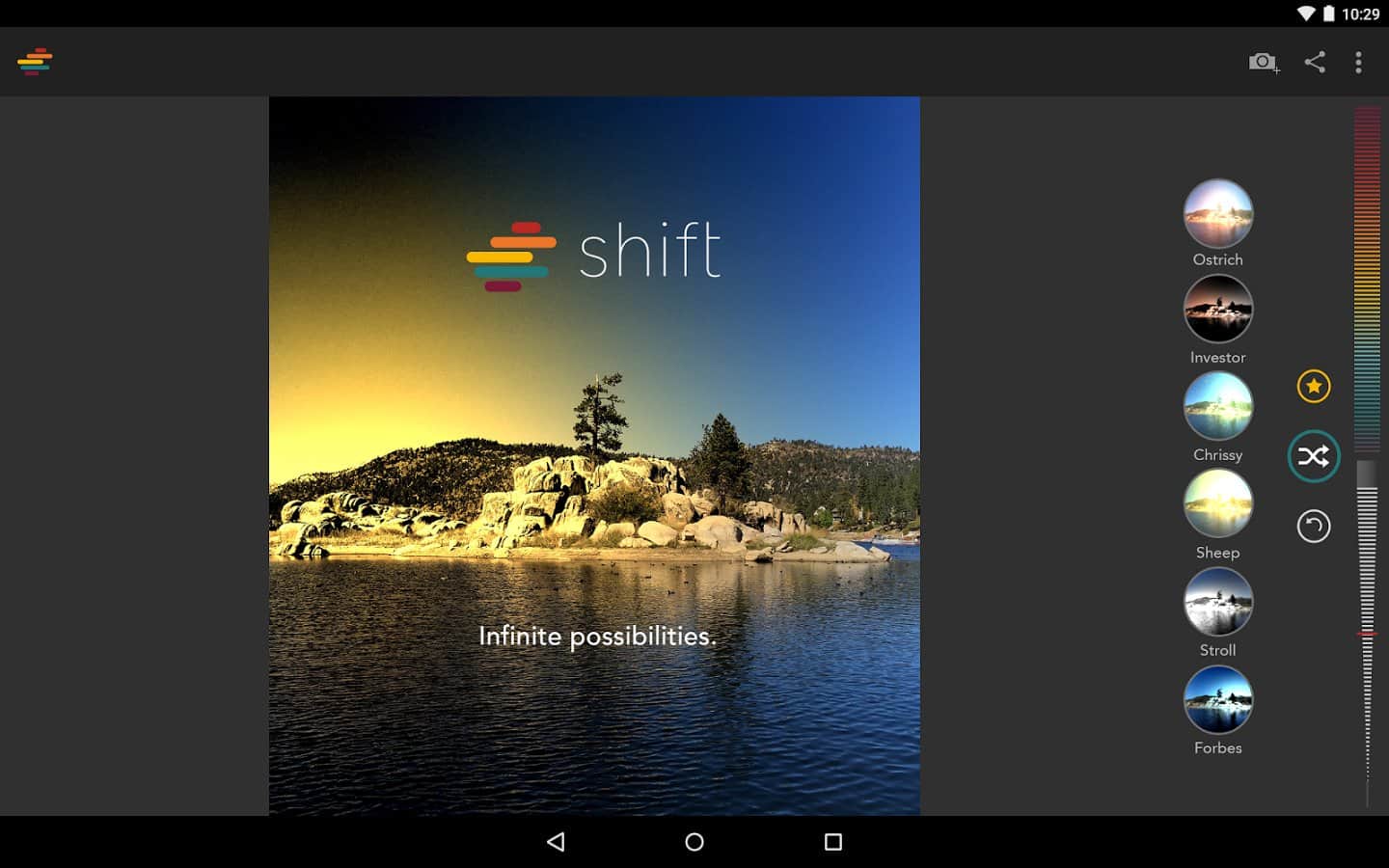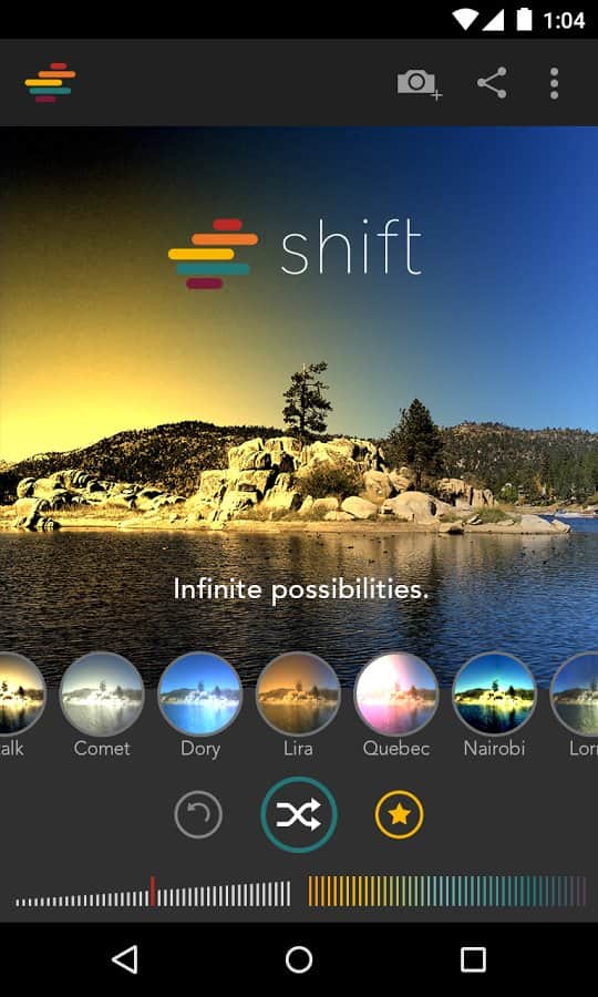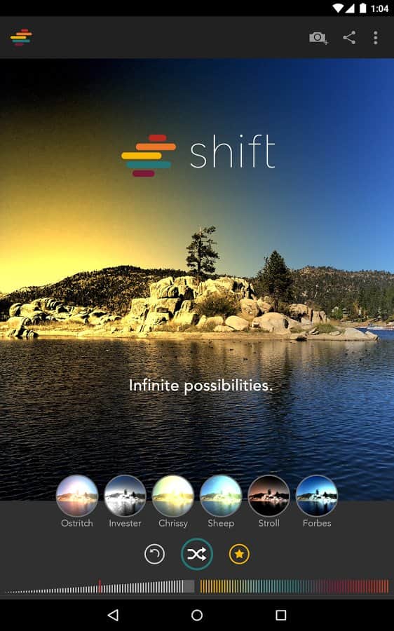 Shift - Почувствуйте себя профессиональным фотографом, используя данное приложение. Здесь использована новейшая система подбора цветов и фильтров, для ваших фотографий. Выберите один из готовых вариантов, или же создайте свой собственный. Управление фильтром довольно простое, у вас будет три основных точки, при перемещении которых будет меняться значение фильтра. Вы можете сдвигать его, передвигая сразу все точки, или же двигать их отдельно, тем самым меняя одно из значений. Не нужно ограничивать себя скудным набором готовых фильтров, которые созданы не вами. Создайте свои собственные уникальные, и крутые фильтры.