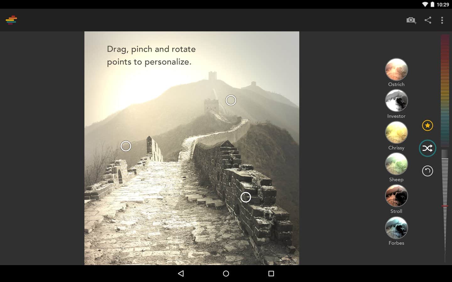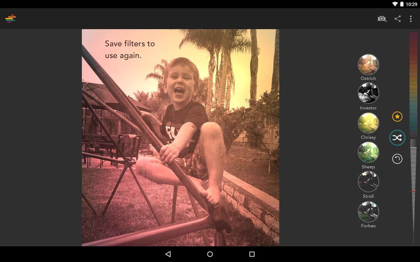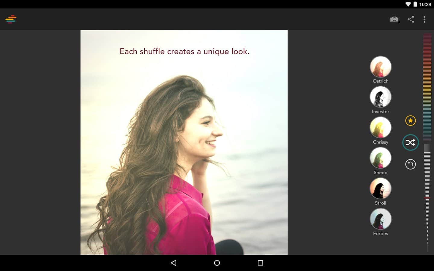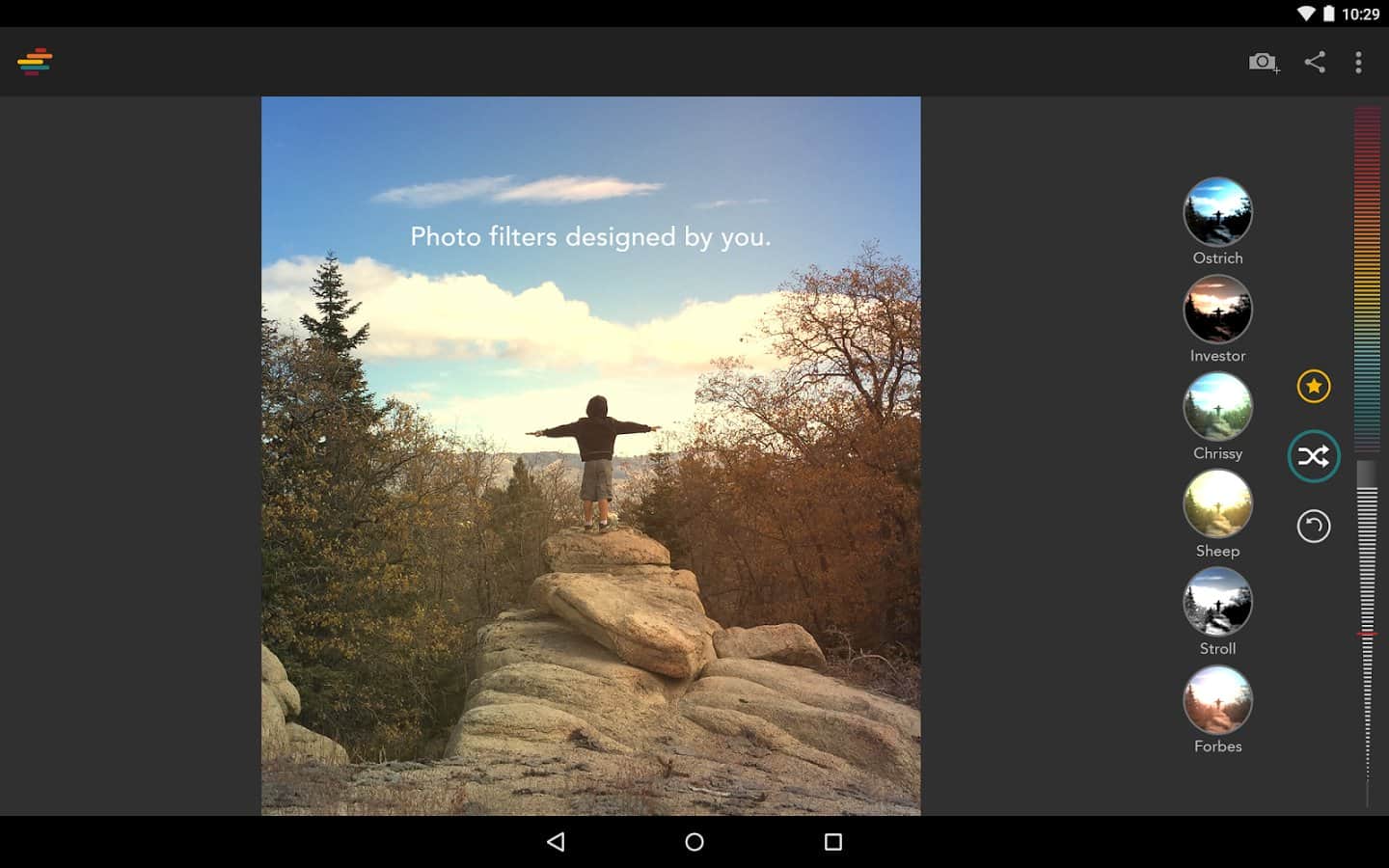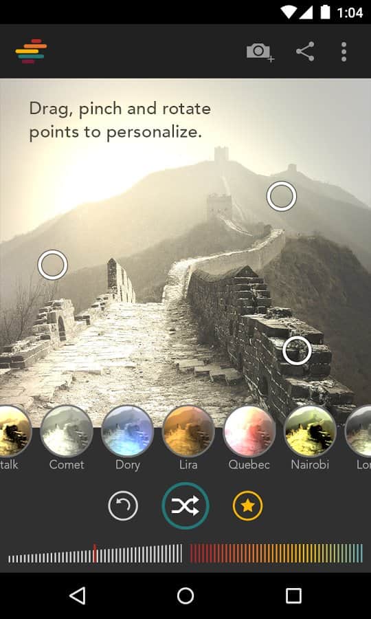 Shift - Почувствуйте себя профессиональным фотографом, используя данное приложение. Здесь использована новейшая система подбора цветов и фильтров, для ваших фотографий. Выберите один из готовых вариантов, или же создайте свой собственный. Управление фильтром довольно простое, у вас будет три основных точки, при перемещении которых будет меняться значение фильтра. Вы можете сдвигать его, передвигая сразу все точки, или же двигать их отдельно, тем самым меняя одно из значений. Не нужно ограничивать себя скудным набором готовых фильтров, которые созданы не вами. Создайте свои собственные уникальные, и крутые фильтры.