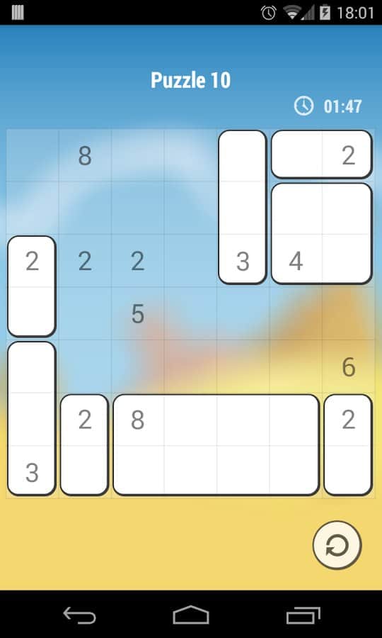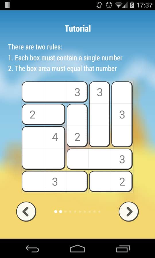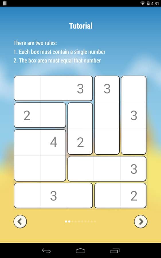 Shikaku - Думаете вы очень внимательны? Проверьте себя ещё раз. Эта на первый взгляд простая игра, может стать довольно сложным испытанием. Задача весьма банальна, у вас на экране есть игровое поле, в некоторых клетках находятся цифры, и ваша задача заполнить все поле квадратами. При этом каждая цифра должна попадать в отдельный участок, и данный участок должен содержать в себе столько квадратов,сколько соответствует числу на цифре. Если вам все ещё не ясна задача, просто пройдите обучение, там все подробно описано. Первые уровни могут показаться очень простыми, но с каждым новым уровнем задача будет становится все сложнее.