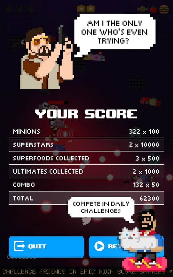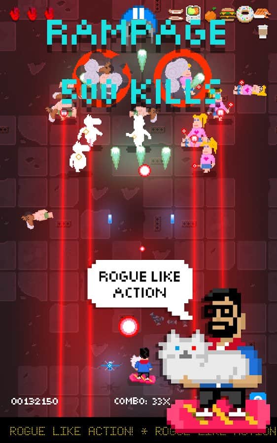 Shooting Stars! – веселая игра с прекрасным юмором на андроид, где вам предстоит уничтожать космических захватчиков с помощью лазерокотэ. Эта красивая аркадная стрелялка которая порадует вас неповторяющимися уровнями, разнообразным оружием и радужными лазерами. Злобные пришельцы решили напасть на вашу планету и вам во чтобы то не стало необходимо защитить ее. В этой игре вы познакомитесь с более 50 видами неповторимого оружия, меняя которое вы будете полностью менять свой стиль игры. Применяйте различные атаки, накапливайте бонусы и вступайте в бой с боссами такими как: Дастин Бимер, Пью дер Пай, Кенни Ист и другими. Соревнуйтесь с друзьями и ставьте свои рекорды в игре