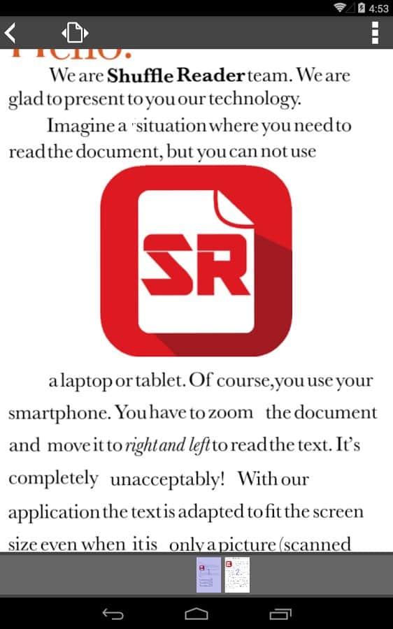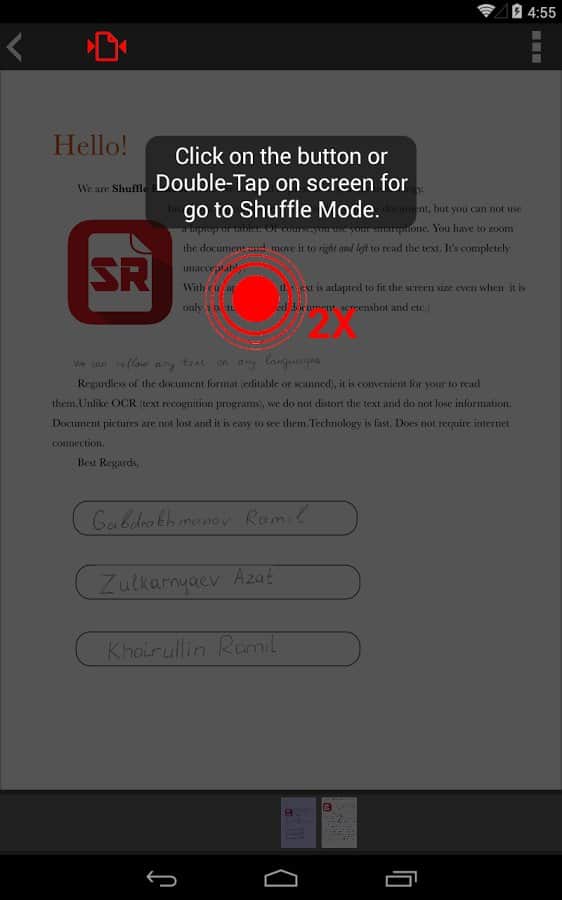 Shuffle Reader – весьма интересное приложение для чтения PDF документов без текстового слоя, что позволит максимально комфортного читать документы на смартфонах. Продуманный интерфейс, чтение как редактируемого, так и сканированного текста без искажения и потери информации, в том числе и изображений. Не требует подключения к интернету.