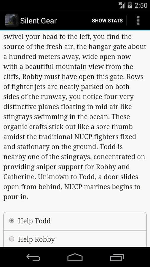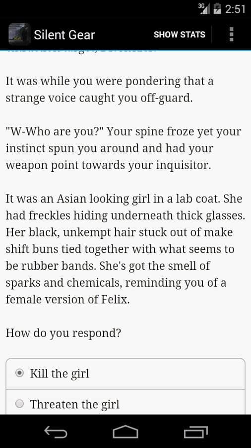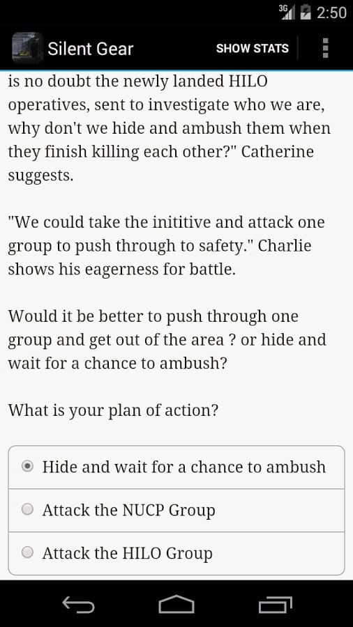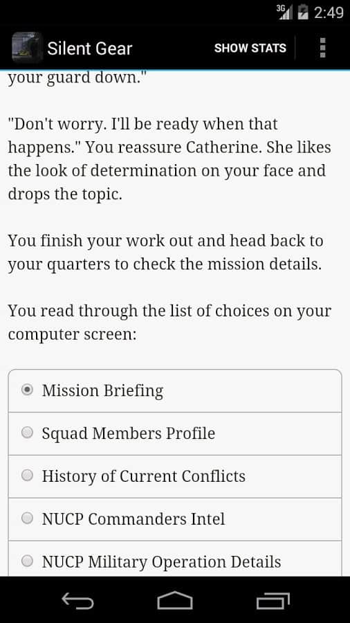 Silent Gear – интерактивная игра на андроид, которая перенесет вас в далекое будущее 2032 года. После очередного экономического спада США потеряли контроль над миром и звание сверхдержавы. Россия и Китай объединили свои силы и создали коммунистическую партию (NUCP). Захватив большую часть Азии и Европы, они стали ведущим игроком на мировой арене. Террористы тоже активировали свои силы, захватив весь Ближний Восток и чтобы уравновесить силы и остановить атаки террористов, НАТО создала дополнительный отряд (AROC), который занимался разведкой и передачей данных. История игры начинается с того что вы возьмете под свой контроль этот отряд и будете принимать серьезные решения, от которых будет зависеть судьба вашей команды. Игра порадует вас различными мини-играми, двумя боями которые потребуют от вас применить все свои стратегические навыки и несколькими вариантами концовки.