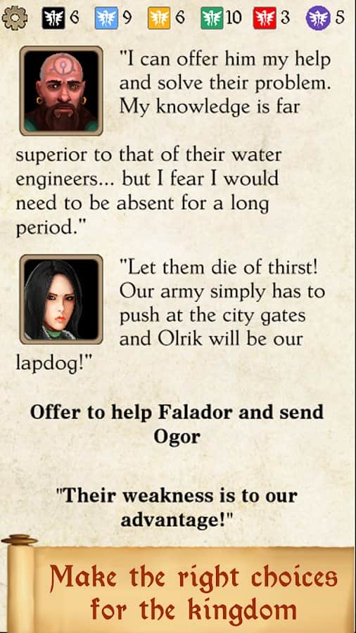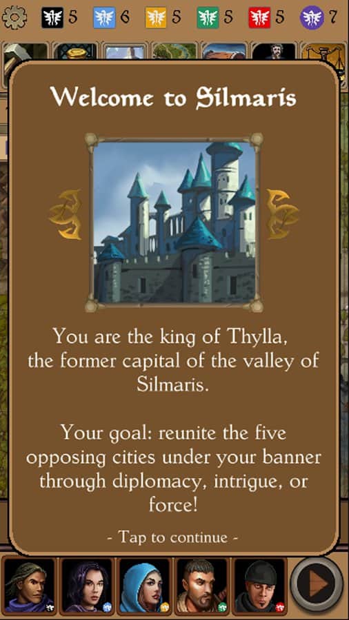 Silmaris - strategic boardgame and text adventures – ролевая игра на андроид, где вы будете управлять городом Тилла который вы должны восстановить и вернуть ему утраченную силу. Станьте мудрым правителем и приведите свой город к процветанию и достатку, а также покоряйте других монархов в долине. Нанимайте советников и отправляйте их в различные миссии по долине. Ведите войну против других монархов и создавайте свои альянсы. Не забывайте вести торговлю и исследовать новые территории. Шпионьте за своими врагами, ведите против них сговор и делайте все возможное чтобы завладеть всей долиной. Игра порадует игроков десятками захватывающих историй и неожиданных поворотов.