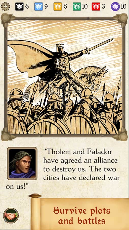 Битв в игре нет, только выбрасывание кубиков, ИИ других городов на глобальной карте ограничен и после поражения/альянса просто выключается.