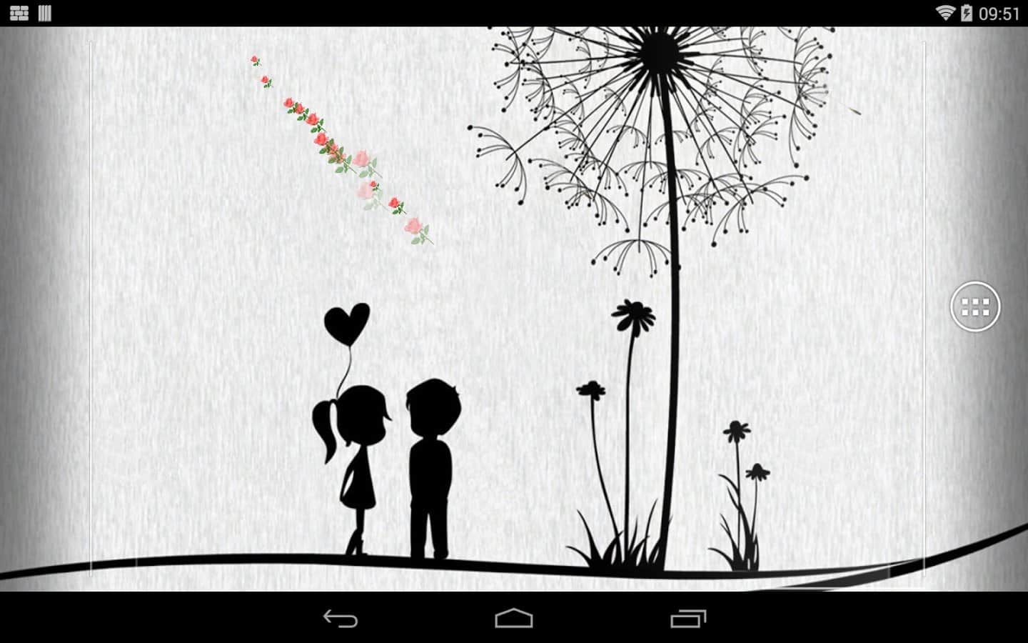 Simple Love Wallpaper – милые живые обои про влюблённого мальчика и девочку стоящие возле огромного одуванчика. Живые обои выполнены в чёрно-белых тоннах и лишь красные розы разбавляют серые краски. Хотя обои и выполнены в тёмных тонах , они всё равно переносят вас в сказочный мир любви и сказок. При желании можете понаблюдать как осыпается одуванчик. Живые обои реагируют на движения.Инструкция по установке:Заходим в главная страница Выберием «Меню» Выберием «Живые обои»Находим необходимые обои и устанавливаем их на рабочий стол