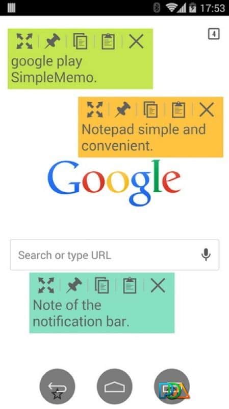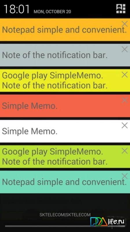 Simple Memo – один из необходимых программ на вашем мобильном девайсе является блокнотом, или другой простенький инструмент позволяющий быстро записать свои мысли, какие-либо данные и другой материал, который необходимо записать, так как есть большая вероятность его просто забыть. Я думаю у каждого была такая ситуация, естественно ручка и бумага с собой есть не всегда, да и клочок бумаги может запросто потеряться. А мобильный телефон есть у каждого и практический всегда с собой. Записывайте заметки в блокнот и они всегда будут при вас. Есть возможность создавать примечания из панели уведомлений.