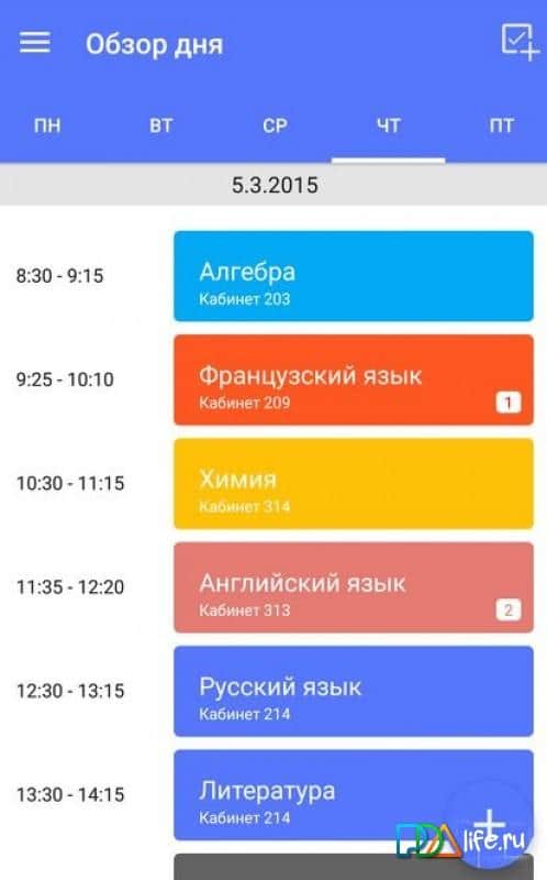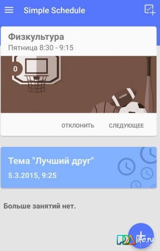 Simple Schedule - отличное приложение, которое в первую очередь пригодится ученикам средней школы, а так-же студентам техникумов, институтов, университетов и других образовательных учреждений. Надоело записывать на клочке бумаги расписание предметов на завтра. Постоянно его забываете и через день спрашиваете у своих однокурсников, какие занятия тебя ждут на следующий день. Если это всё про тебя, тогда это приложение тебя спасёт. Внеси своё расписание одни раз, и оно всегда буде ту тебя под рукой. Помимо всего, программа может помочь в ведении графика контрольных работ, тестов, экзаменов, а также следить за выполнением домашних заданий.