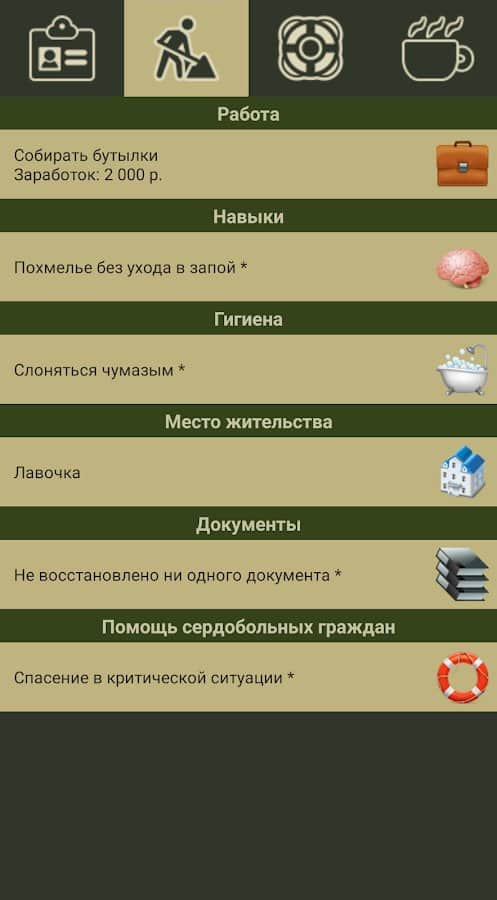 Симулятор Бездомного - продержитесь в облике нового персонажа - бомжа, и постарайтесь выжить. Вы пройдете трагичный и реальный путь от стадии банкротства до серийного убийцы и далее. У вас почти не будет денег, сытость и здоровье будет на минимуме, а зависимость от алкоголя или других препаратов повышаться. Собирайте бутылки и продавайте их за копейки, занимайтесь интересными вещами (музыкой, рисованием, игрой на гитаре..), читайте собственные события в жизни, изучайте мудрость, меняйте место жительства и пытайтесь вырваться в окружение обеспеченных людей.