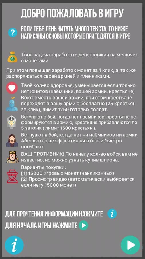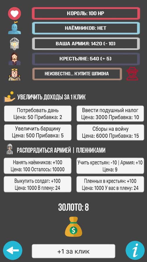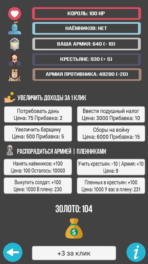 Симулятор Короля – кликер на андроид, где вы сможете побывать в роли короля огромного государства. В этой игре вашей главной задачей будет защитить свое королевство от набегов врагов и при этом не разорить свою казну. Разрабатывайте свою стратегию игры, ведь от каждого вашего клика по экрану будет зависеть судьба всего королевства. Собирайте огромную армию воинов, при этом нанимая наемников. Платите солдатам жалование из казны, а пополняйте ее путем ввода новых налогов для крестьян и сбора дани. Постоянно повышайте свои доходы и уменьшайте расходы на содержание армии. Играйте в эту игру и продумывайте каждый свой шаг.