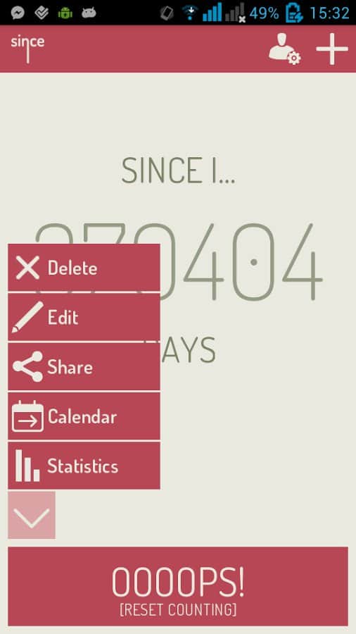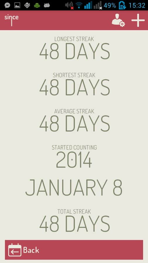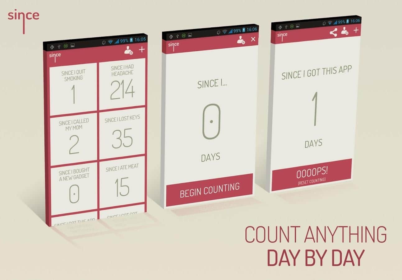 Since - приложение для андроид от Socialus Marketingas. Маленькая и весьма полезная программка позволит вам контролировать, мотивировать, а главное - делиться с друзьями, Вашими успехами! Как именно? Приложение - своего рода счетчик дней, который позволяет зафиксировать любой результат, а также отслеживать его динамику. Это может быть что угодно - от этапов диеты с самого первого дня до ее окончания, времени с момента, как вы бросили пить и курить, помощь в контроле за ежедневным 8-часовым сном (если вы приняли решение перейти к такому режиму сна) и многое другое. Поставьте себе цель и включите счетчик, а когда добьетесь результата - не забудьте поделиться им на Facebook и пр.
