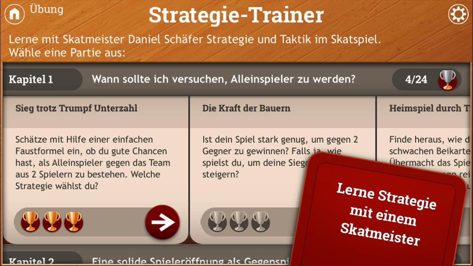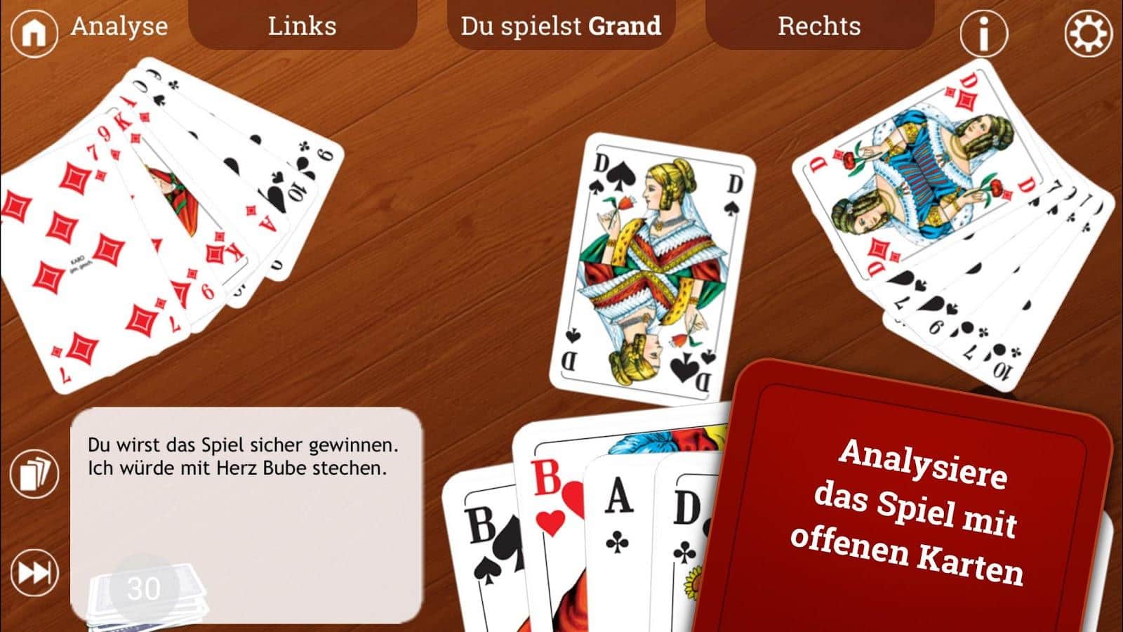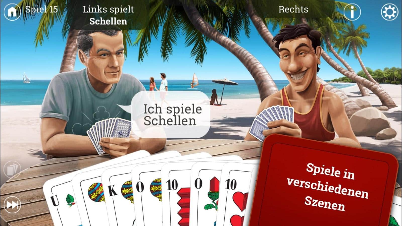Skat HD – захватывающая карточная игра на андроид, где вы будете играть в всеми известную игру Скат. В этой игре вы будете играть против опытных игроков которые не дадут вам просто так победить их. Играйте в любое время и в любом месте и соревнуйтесь с друзьями за лучшие результаты, а также бросайте им вызов. В этой игре вашей главной задачей будет выкидывать ненужные вам карты и стараться сделать так чтобы ваши соперники остались с большой колодой карт. Тренируйтесь играя против компьютерных игроков или соревнуйтесь с реальными. Правила в игре очень просты и не займут у вас много времени для понимания.