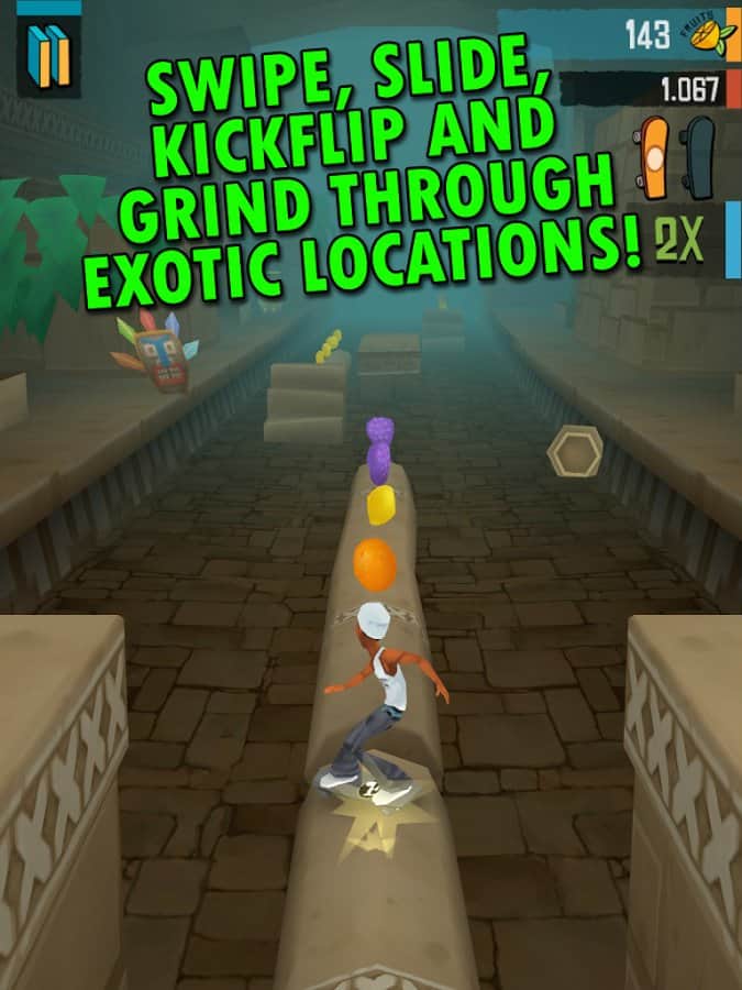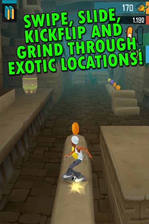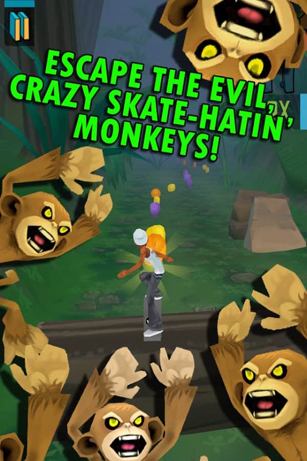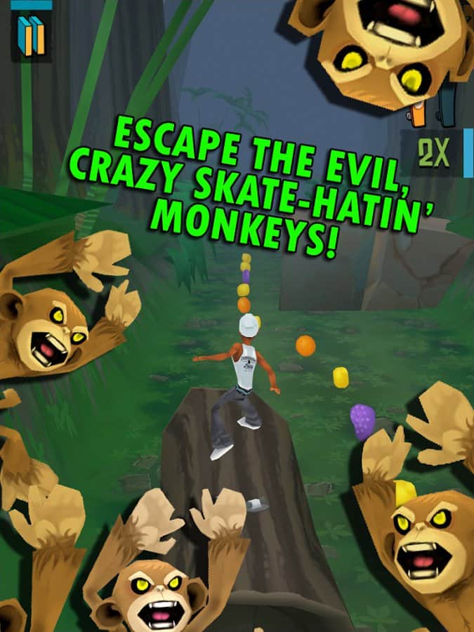 Skate Madness - игра на аndroid, где вам предстоит бегать, прыгать и скользить по джунглям. Убегайте от туземцев и обезьян по пути собирайте бонусы-фрукты, которые помогут вам разблокировать новые способности и улучшить своего героя.