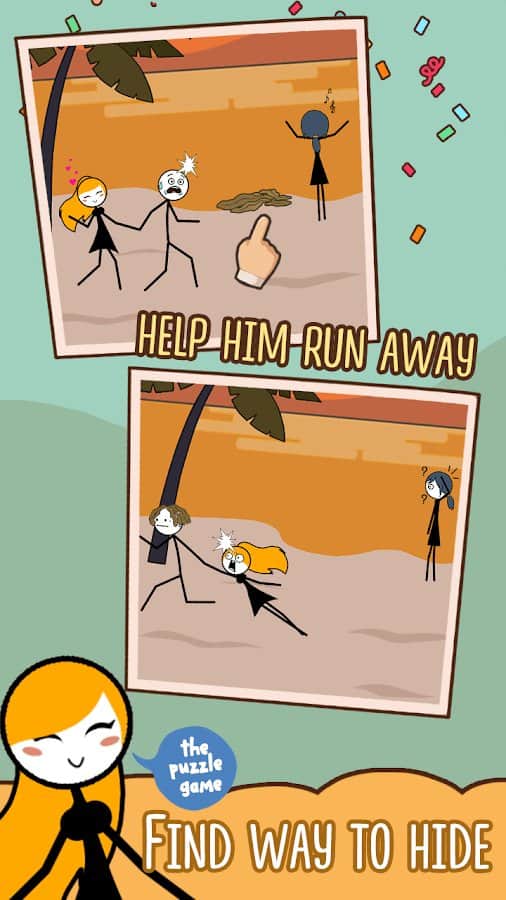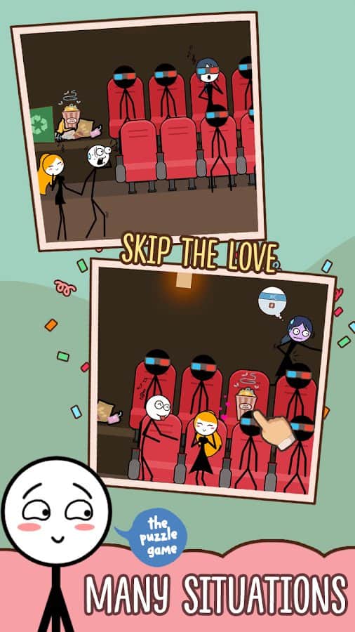 Игра Skip Love - это сочетание головоломок и веселья, ведь нужно спасать мужчину от сложных ситуаций. У него есть хорошая жена, но и любовница. И иногда случается так, что жена может их застукать, ведь она давно подозревает мужа и следит за ним. Поэтому проходите уровни, помогая спрятать все улики и саму любовницу. Будет много локаций, в которых нужно подумать как использовать окружающую среду: спрятаться за кустами, елкой, шарами, в машине, за водой, дарить цветы жене, кинуть попкорн на место жены и прочие действия.