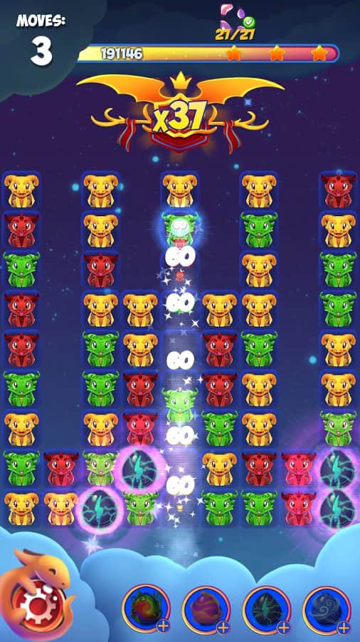 Sky Dragon Stars: Magic Match – игра из жанра три в ряд на андроид, где вы попадете в драконье царство. В этой игре вашей задачей будет соединять по три и более одинаковых по типу дракончиков и их яйца в ряд и убирать их с поля. Прилагайте всю свою логику и наблюдательность, чтобы составить как можно длиннее ряды и набрать максимальное количество очков. Выполняйте все задачи и миссии, предложенные в этой игрой и повышайте свой рейтинг. Применяйте многочисленные бонусы и усиления для того чтобы пройти уровень как можно быстрее и добиться рекордных результатов. Открывайте волшебные яйца драконов и получайте ценные призы и подарки.