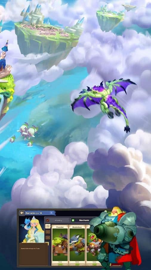 Sky Kingdoms - Castle Siege - военно - экономическая стратегия в которой вам предстоит возглавить масштабную операцию по освобождению своего королевства от коварных захватчиков, при этом стоит помнить, что большая часть событий будет происходить на всевозможных летающих островках. В целом общий алгоритм игры выполнен в привычном для жанра стиле, оригинальность же Sky Kingdoms - Castle Siege для Андроид создается уникальной фэнтезийной атмосферой, потрясающей графикой, всевозможными героями и сотнями заданий и миссий.