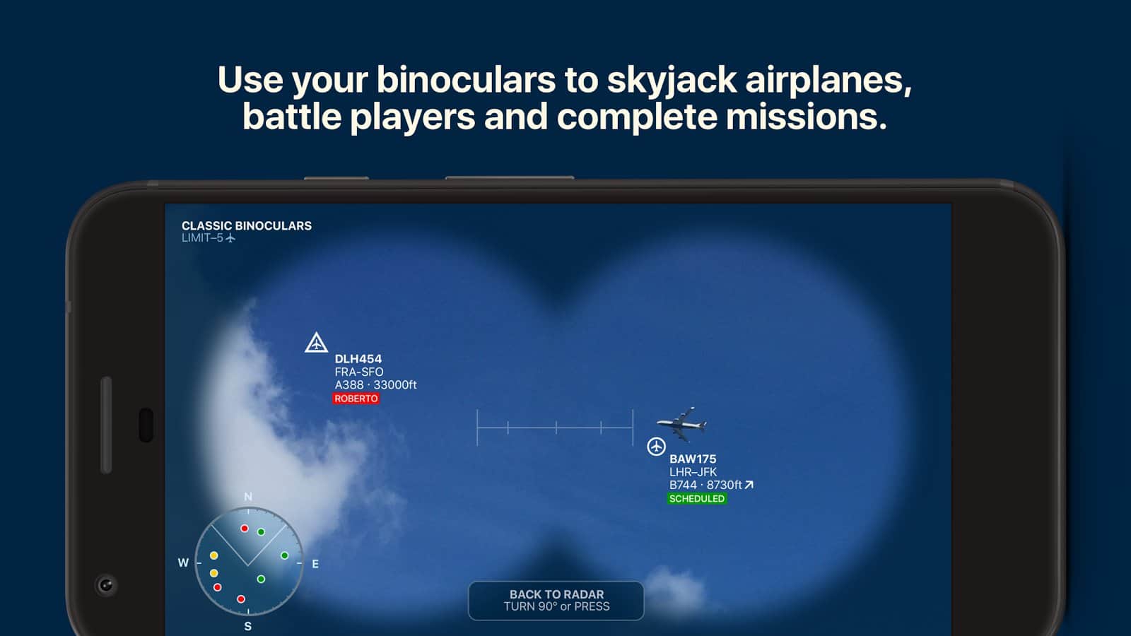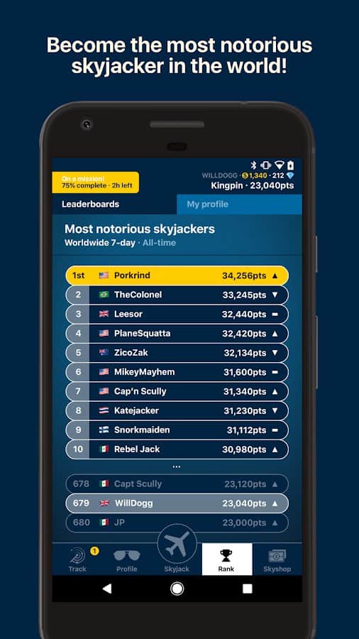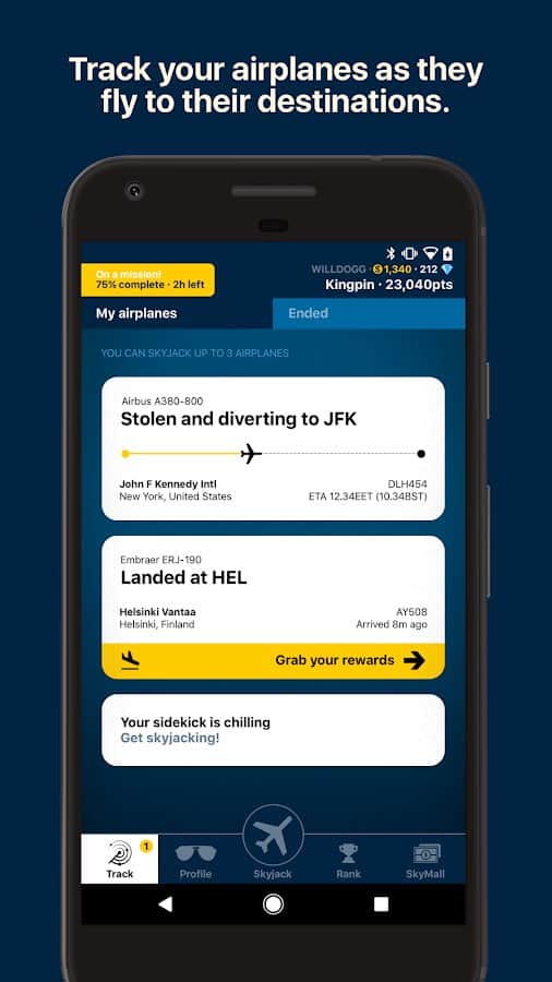 Skyjacker – We Own the Skies – увлекательная игра на андроид, где вы начнете неповторимую охоту на самолеты. В этой игре используя различные приложения вы сможете отслеживать полеты настоящих самолетов и собирать их пополняя свою коллекцию. Атакуйте и собирайте самолеты в режиме реального времени и соберите свою огромную коллекцию. Для того чтобы защитить свои самолеты от соперников необходимо применять антирадары и другое современное оборудование предложенное игрой. Открывайте новые аэропорты в разных уголках планеты и добивайтесь отличных результатов в этой игре. Всего в игре предложено 600 самолетов и 7000 аэропортов.