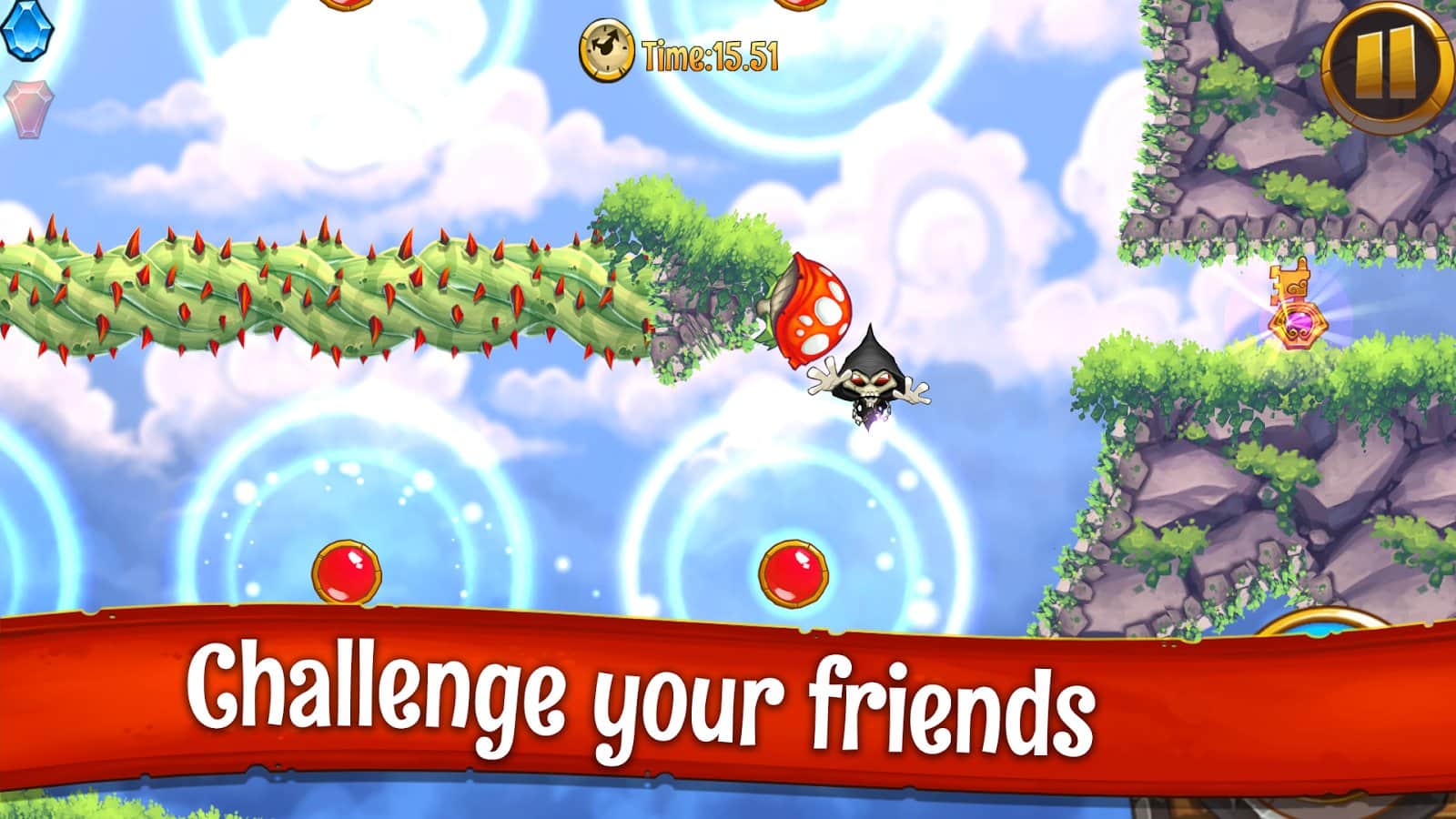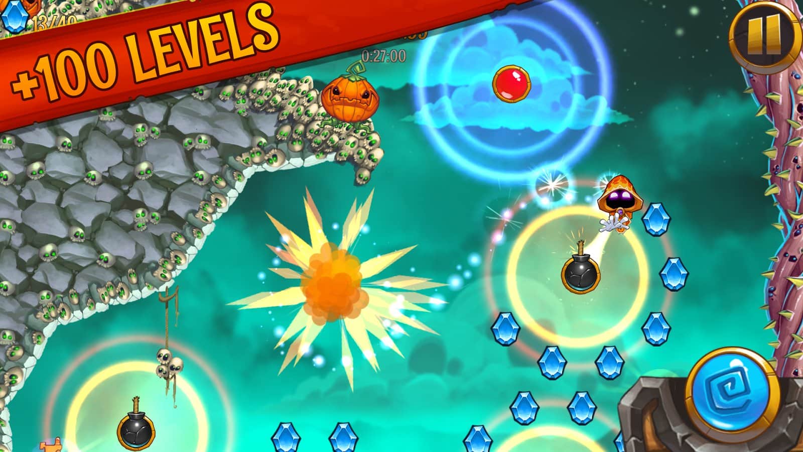 SkyJumper - откройте для себя уникальный мир, полный тайн, ловушек и различных испытаний. Играем неизвестным существом, которому необходимо собрать на уровне как можно больше кристаллов. Передвигаемся с помощью разбросанных по локациям грибам, которые амортизируют вашу посадку и при этом отталкивают, тем самым помогая вам двигаться. Помимо грибочков вам на пути встречаются сферы, вокруг которых можно крутит, вокруг их оси. По дороге остерегайтесь бомб, шипов и других коварных ловушек, которые способны в один миг остановить ваше приключение. В игре вас ждет более 100 уровней с 6 различными мирами для изучения. Свои достижения вы всегда сможете увидеть в таблице лидеров.
