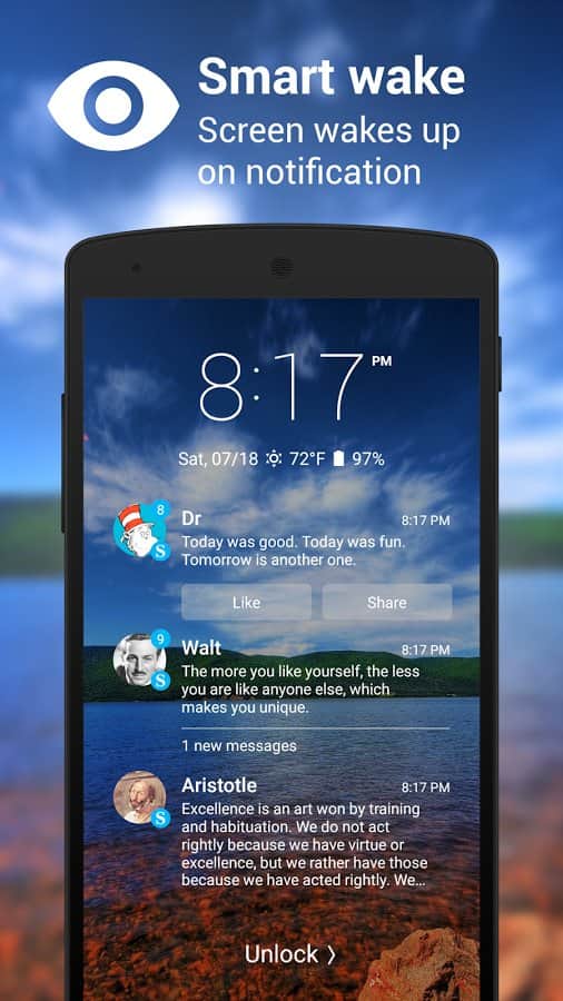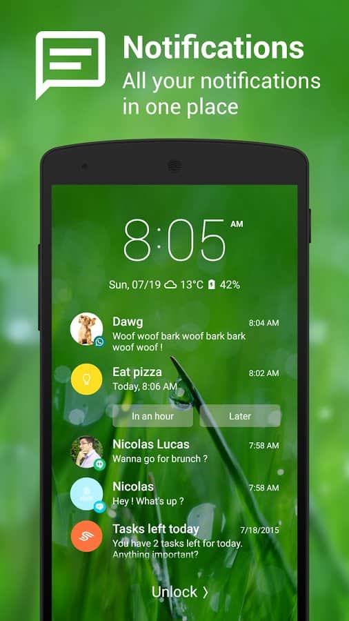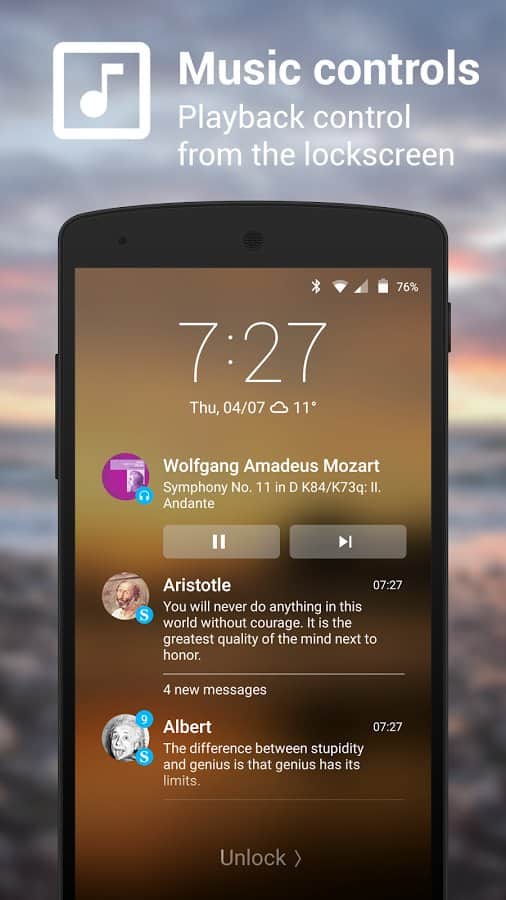 Данный экран блокировки успешно заменяет стандартное решение и, надо признать, отлично выглядит. Кроме внешнего приятного оформления, локер может похвастать защитой в виде графического ключа или пин-кода. Из полезной информации, на экран выводятся время, погода, уровень заряда батареи, уведомления, на выбор пользователя и управление музыкальным плеером, если он запущен.