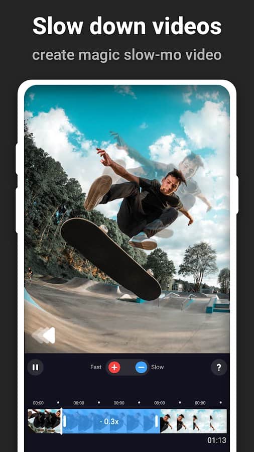 Slow motion - slow mo, fast mo - Замедлять или ускорять время в любой видео сейчас стало очень просто! Выберите, какую именно скорость вы хотите сделать (0,1x, 0,2x, 0,25x, 0,3x, 0,4x, 0,5x, 0,6x, 0,8x, 0,9x, 0,95x), а затем просто настройте добавленную функцию и сохраните готовый результат. Вы можете наложить эффект как на все видео, так и на определенные фрагменты из него, выбирая скорость воспроизведения индивидуально. Независимо от того, поставили ли вы эффект или нет, у вас есть возможность не искажать звук и сохранить его в первоначальном виде.