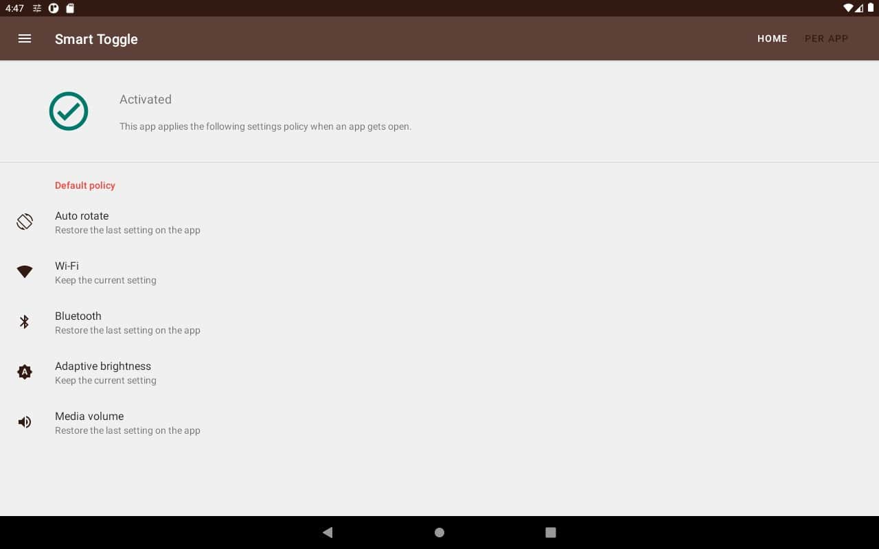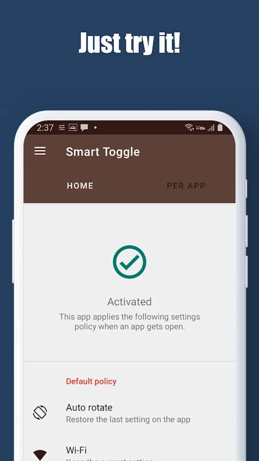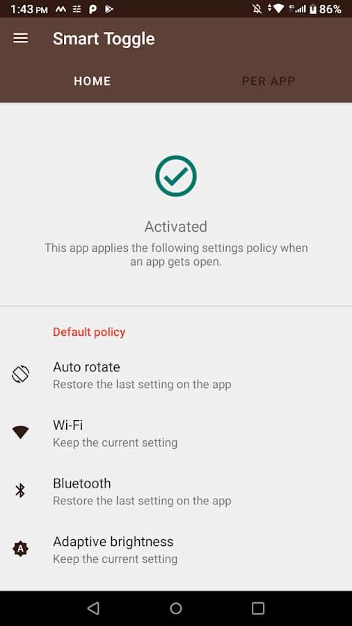 Smart Toggle - забудьте о бесконечном сбросе настроенных настроек в вашем телефоне, избавьтесь от подобных ситуаций и скачайте это удобное приложение! Разработчики позаботились о фиксации переворота смартфона, сохранения данных в категориях Wi-Fi, Bluetooth, настройки яркости, а также объемом средствами масовой информации. Непременно попробуйте отключить автоматическое выключение экрана по истечению ограниченного времени на некоторых приложениях. Незаменимая вещь всегда пригодится, даже если сейчас она и вовсе не нужна.
