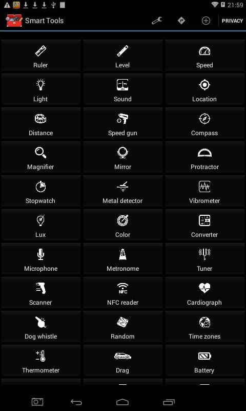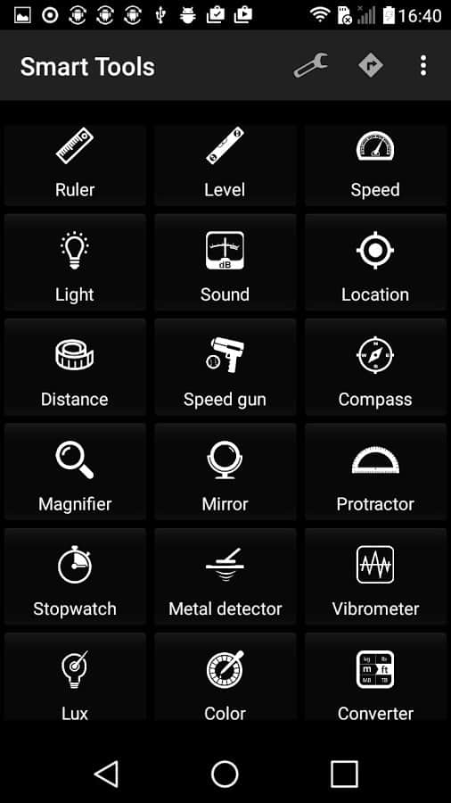 Smart Tools - Множество различных инструментов в одном приложении, здесь есть практически всё и на все случаи жизни. От фонарика, до навигатора, всё это удобно укомплектовано и разделено. Все устройства отлично выполняют свои функции, и работают используя детали вашего смартфона. Так же стоит заметить что они поддерживают несколько форматов подсчетов данных, а так же множество языков, что значительно упрощает работу с приложением.