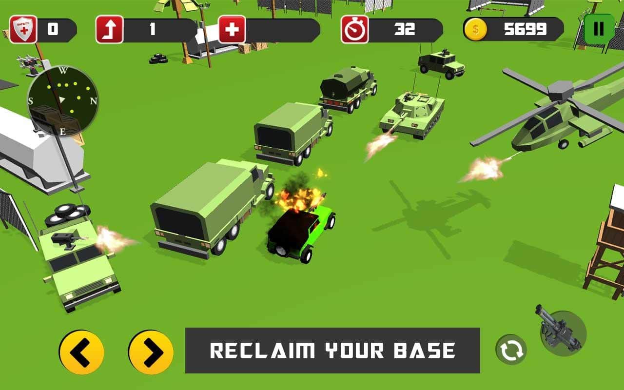 Smashy Car Riot: Busted Patrol – ваша военная база попала в засаду, в этот момент вы были за рулём военного развед автомобиля. Ваш батальон был уничтожен. Террористы в настоящее управляют базой, и теперь только именно вы можете спасти базу от захватчиков. Уничтожьте всех террористов на карте, гоняйте на своём джипе, давите террористов, используйте пулемёт. Будьте внимательны, если вы увлеклись уничтожением врага, смотрите внимательно на дорогу, любое столкновение с танком, машиной, забором или другим предметов выведет из строя вашу технику.