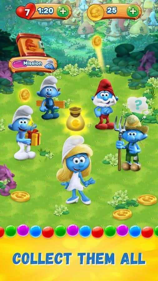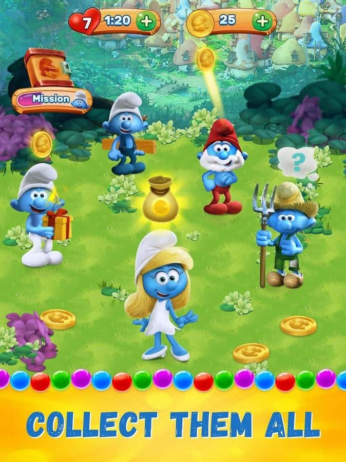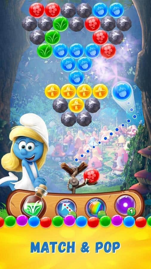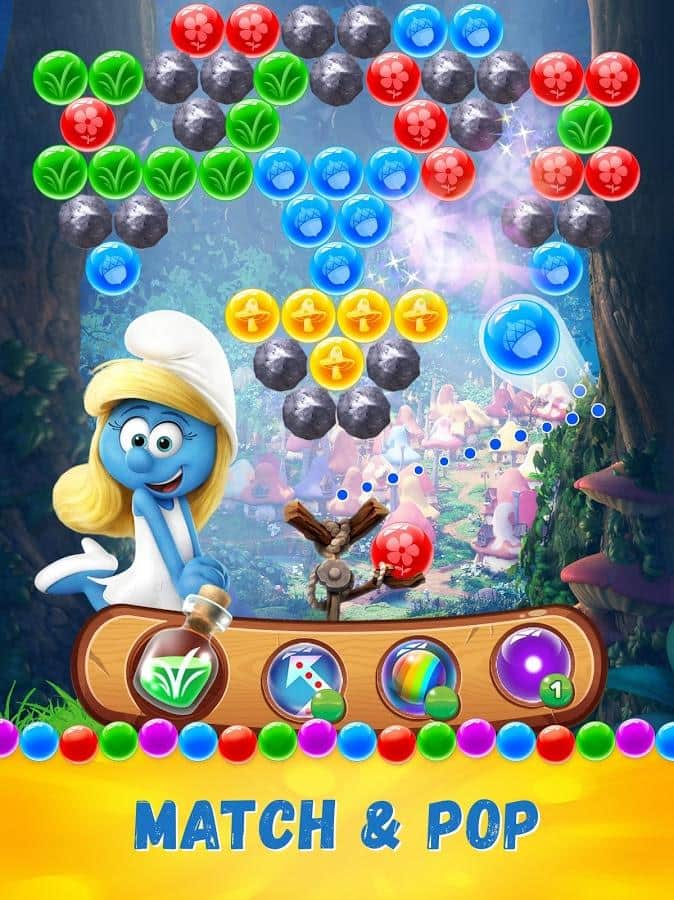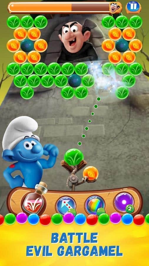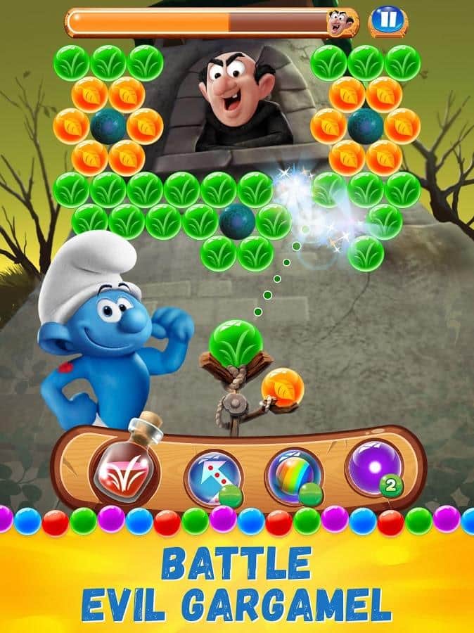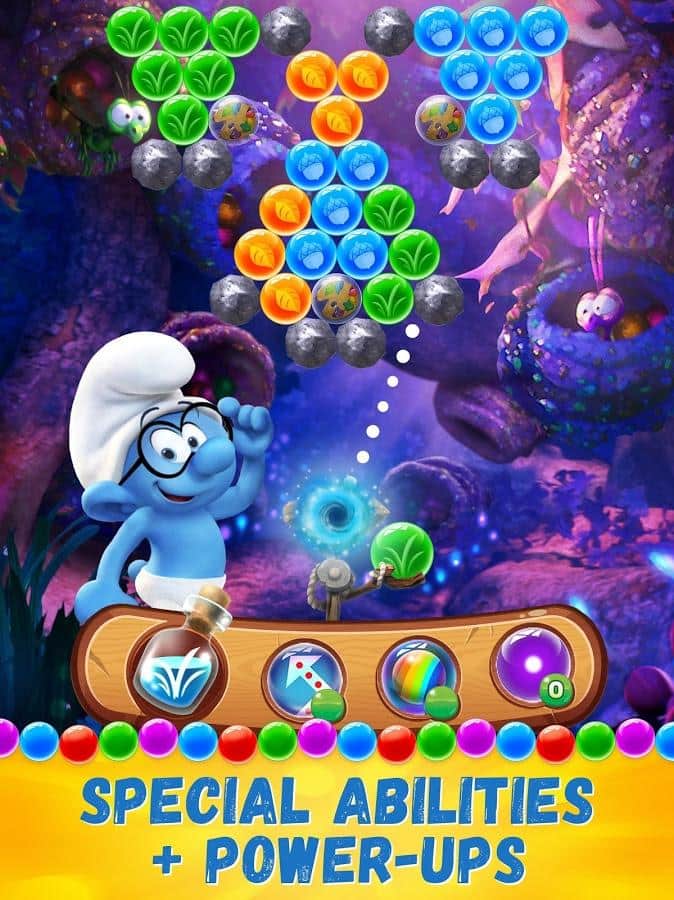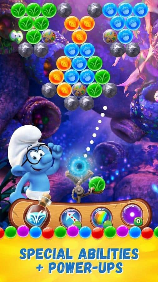 Smurfs Bubble Story – веселая игра на андроид, где вы будете помогать смурфикам, взрывать разноцветные пузыри. В этой игре вы отправитесь в увлекательное путешествие по сказочному лесу, где будете встречать на своем пути диких животных и побеждать коварных злодеев. Выполняйте интересные задания и взрывайте одним выстрелом как можно больше разноцветных пузырей. Откройте для себя всех персонажей знаменитого мультфильма и пройдите все уровни этой игры. Прицеливайтесь и стреляйте шариком так чтобы взорвать как можно больше шаров находящихся в верхней части экрана и быстрее пройти уровень игры. Добивайтесь отличных результатов и соревнуйтесь со своими друзьями.