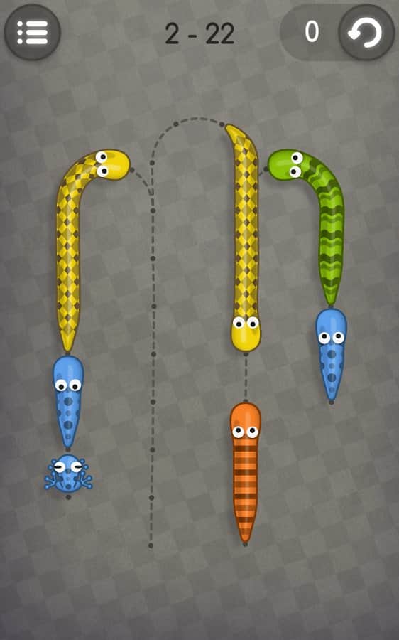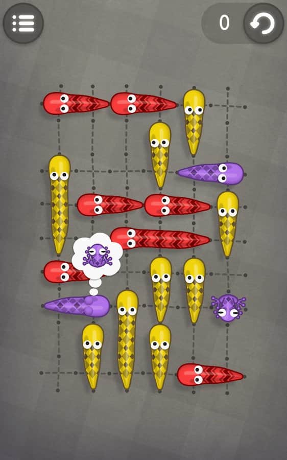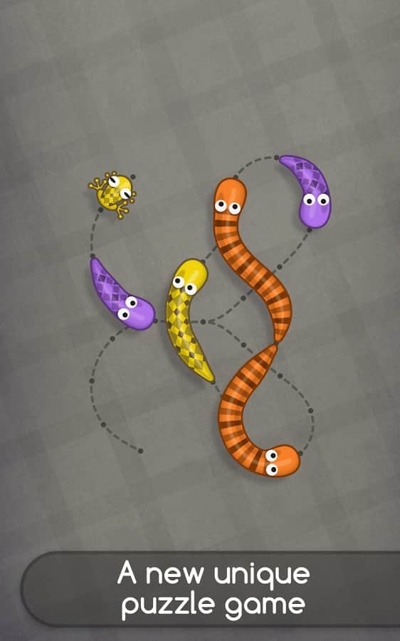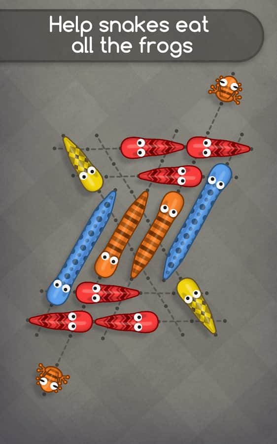 Snakes like Frogs - игра на аndroid, в которой вам предстоит накормить змеек их любимыми лягушками. Для этого вам предстоит разгадать большое количество сложных головоломок. Перемещайте змеек по их дорожкам и ешьте лягушек только такой же раскраски, как и сама змейка. Зарабатывайте по три звезды, в каждом уровне прилагая для этого все свое логическое мышление.