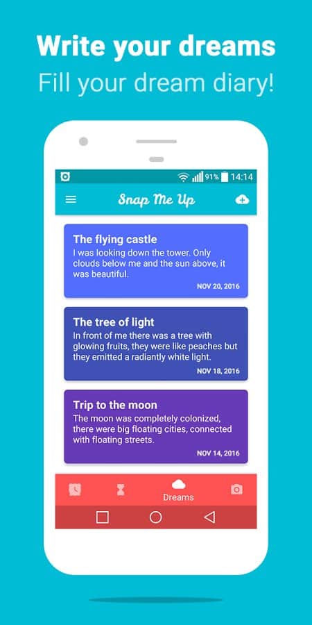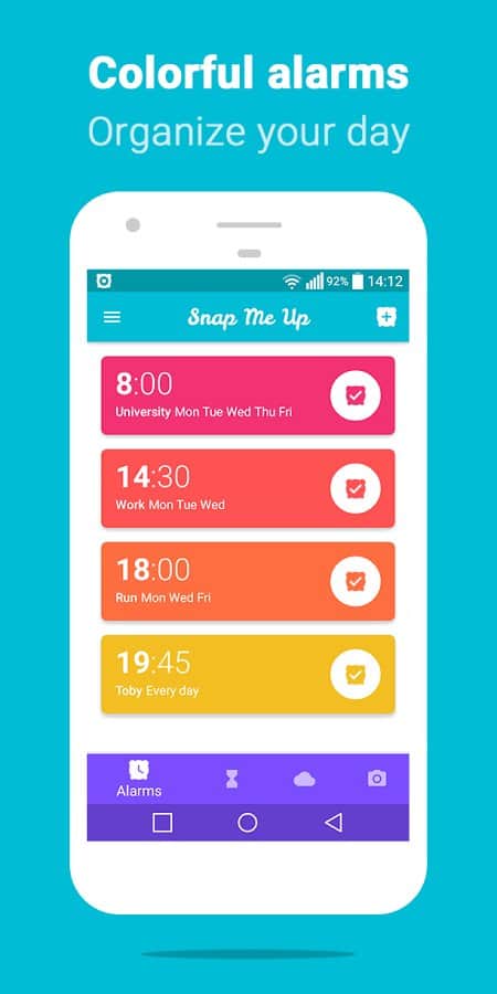 Snap Me Up: Selfie Alarm Clock - Тяжело просыпаться по утрам? С этим будильником вставать будет куда сложнее, но вы точно встанете. Все что нужно для того что бы его выключить это сделать правильное селфи! Каким же образом оно работает, да все очень просто, просыпаетесь, нащупываете свой смартфон и делаете селфи. Если все получилось то будильник выключается. Если же у вас никак не получается сделать правильно селфи, можете ввести дополнительно код, который будет отключать будильник, иначе он будет звонить без остановки.