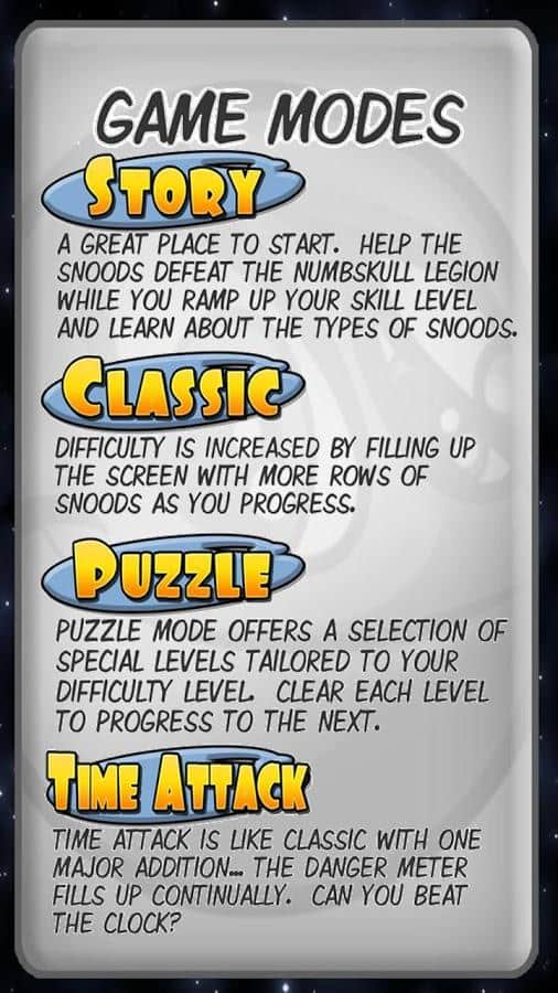 Snood – игра-головоломка на андроид, где вашей задачей будет составлять ряды из забавных мордочек. Касайтесь экрана своего телефона или планшета в нужный момент и запускайте мордочку в полет, составляя по три одинаковых по цвету объекта в ряд. Как только три объекта станут в ряд они исчезнут, а вы получите очки. Тренируйте свою отличную реакцию и сообразительность и стреляйте мордочками в нужные места. Проверьте на деле все режимы игры и поднимитесь как можно выше в таблице лидеров и достижений.
