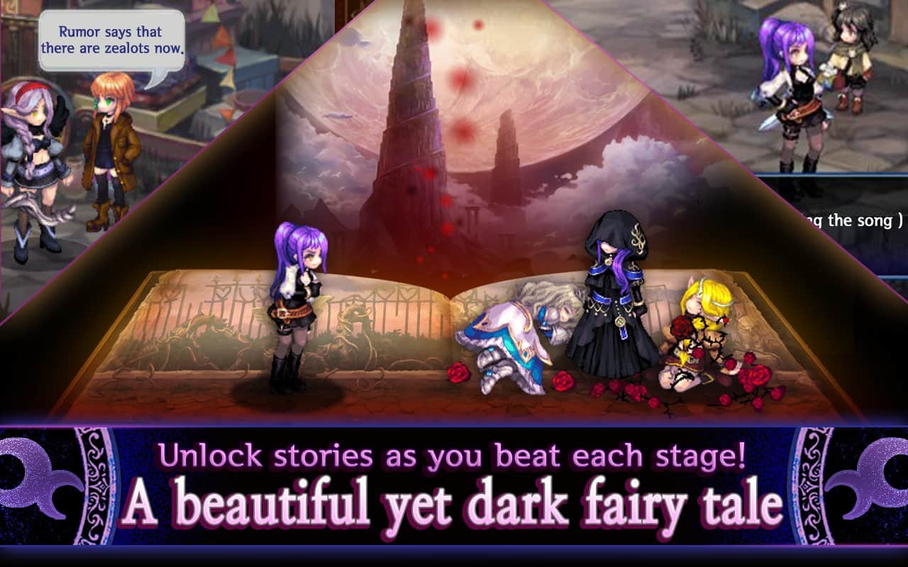 Song of the World :A beautiful yet dark fairy tale – игра на андроид, где вы будете управлять командой героев и помогать им изменить свою судьбу. В этой игре вы познакомитесь с главными героями, такими как эльф Зион и принцесса Люсия, а также с другими героями, которые любыми путями хотят вернуться в прошлое и изменить свою судьбу и судьбу всего мира. Каждый герой в этой игре имеет несчастливую судьбу и старается изменить ее. Отправляйтесь в прошлое где на каждом шагу вас будут подстерегать враги и монстры. Применяйте умения каждого героя и улучшайте их по ходу игры. Приобретайте костюмы и снаряжение и проходите все миссии.