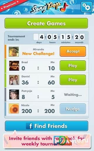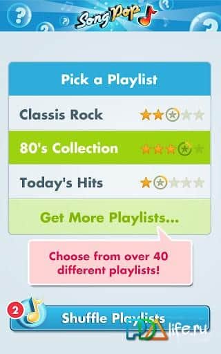 Song Pop – увлекательная поэтапная музыкальная викторина для андроид, напоминающая телепередачу "Угадай мелодию". Вам предстоит отгадать название песни или исполнителя из 5 песен. Песни относятся к одному жанру (например, "Классический Рок" или "Современные Хиты"), который выбирается перед началом очередной игры. Участвуют два игрока и поэтому кто из Вас быстрее угадает, тот победит в раунде, получит больше "нот". Чем больше "нот" тем больше новых музыкальных жанров можно купить. Музыкальные жанры так же можно покупать за наличные деньги, а не добывать в музыкальных сражениях с другими.