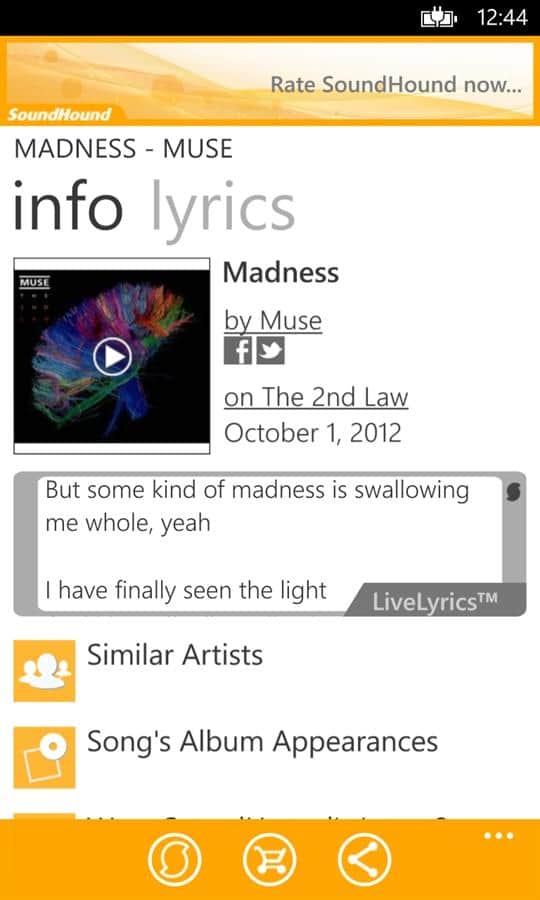 SoundHound – популярная программа для распознания музыки на windows phone, которая вычислит песню, напетую даже в микрофон телефона или записана через него. Очень быстрое распознание, от 4х секунд! Сервис SoundHound имеет собственную библиотеку содержащую большое ко-во треков, тексты песен.