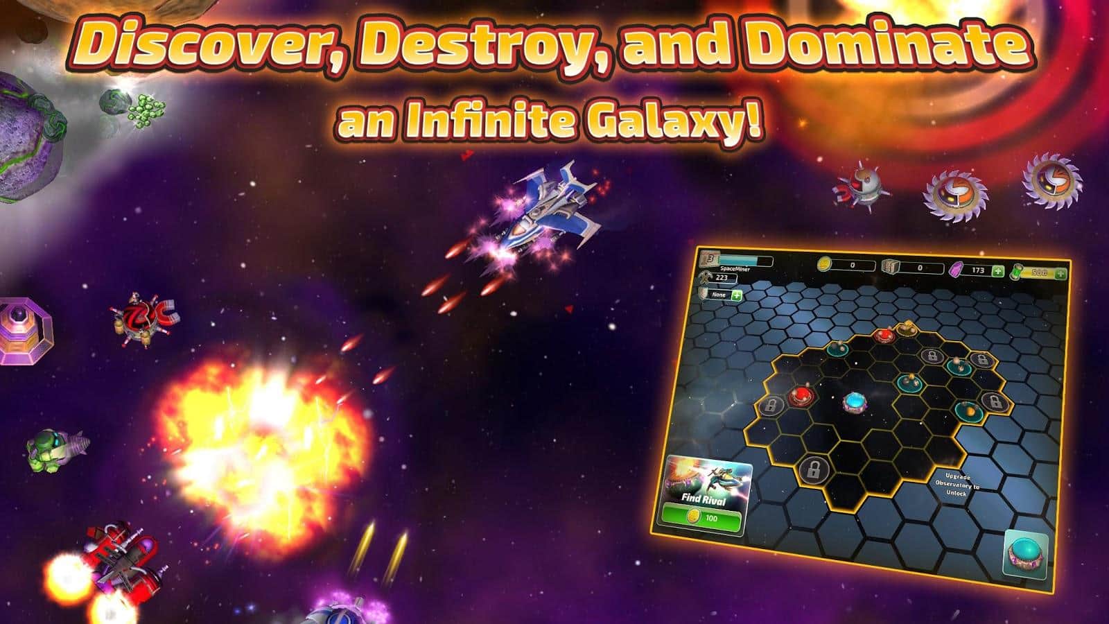 Space Miner Wars – в этой игре вы отправитесь покорять безграничное космическое пространство на своем космическом корабле. В игре вашей главной задачей будет исследовать космическое пространство, добывать себе ценные ресурсы с астероидов и сражаться с врагами. Станьте рудокопом и ищите скопление ценных ресурсов, ведя свой космический корабль из одной звездной галактики в другую. Вступайте в ожесточенные бои с другими игроками и забирайте у них ресурсы. Также не забывайте заниматься строительством своего города и защищать его от нападок врагов. Играйте с друзьями и объединяйтесь с ними в гильдии, сражаясь против сильных врагов. В этой игре вас ждут увлекательные миссии, разнообразные космические корабли и собственный город.