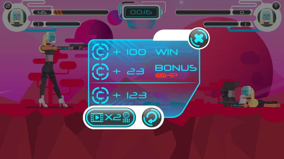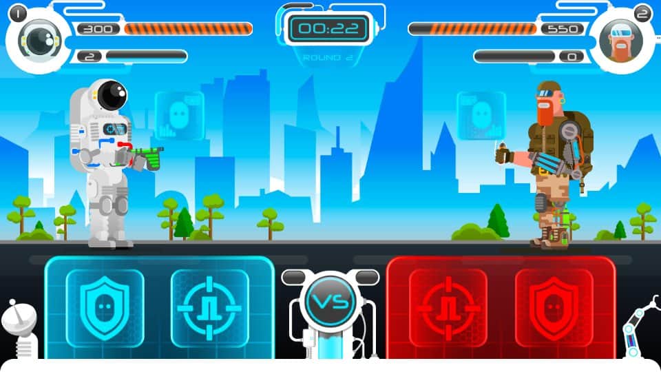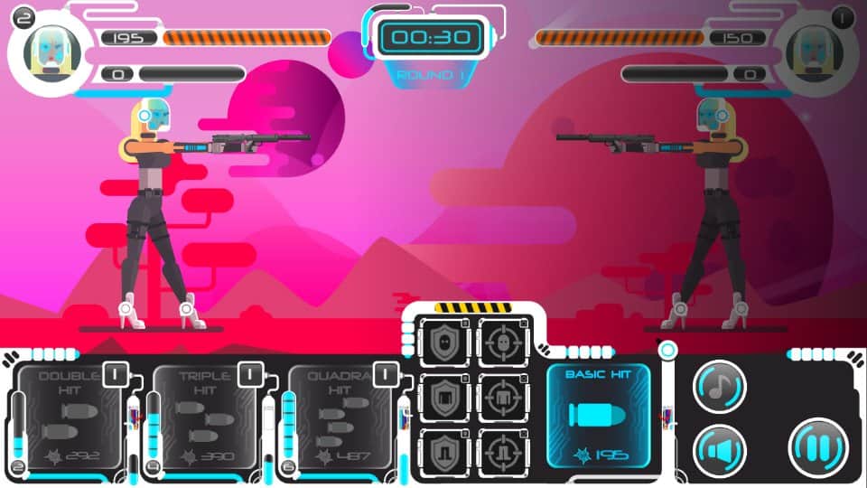 Space Warriors: Duel – примите свое участие в многочисленных и разнообразных дуэлях проходящих с разными игроками. Выбирайте себе героя из троих представленных в игре персонажей и начинайте дуэли. Каждый герой в игре имеет свои приемы, способы атак и защиты. Бои в игре будут состоять из последовательных ударов, которые соперники будут наносить друг другу в разные зоны голову, грудь и ноги. Если вы будете совершать кобмо из удачных ударов, то вам будут открываться возможности применения различных приемов. Поднимайте и прокачивайте уровень своего персонажа и наслаждайтесь красивой графикой и приятной музыкой.