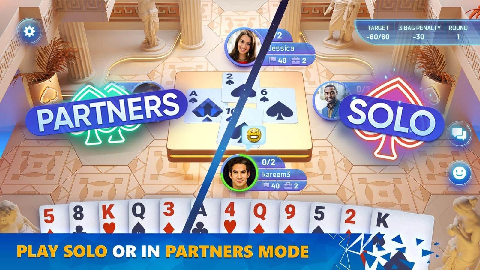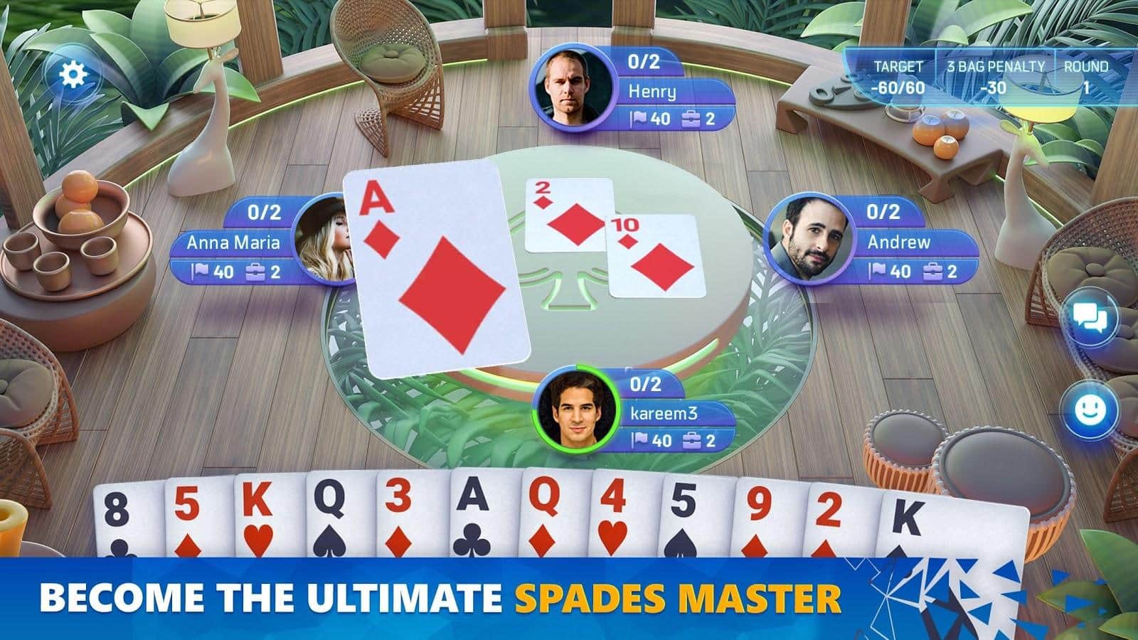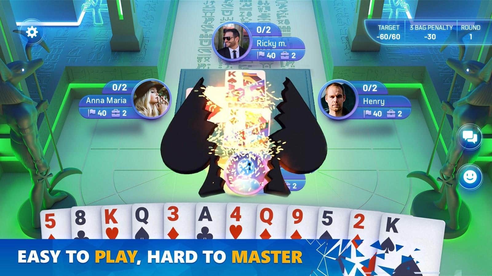 Карточные разделы (червы, бридж, юкр, джин рамми и тарниб) теперь доступны в игре Spades Masters, где разработан качественный и проработанный дизайн! Участвуйте в разных рейтинговых столах, анализируйте статистику и прогресс, получайте медали-достижения, собирайте ежедневную награду, побеждайте в соревнованиях, входите в рейтинг лиги, играйте в одиночку или в команде, меняйте локации, общайтесь в чатах, отправляйте смайлики с эмоциями, научитесь быстро играть и дойдите с новичка до мастера по картам.