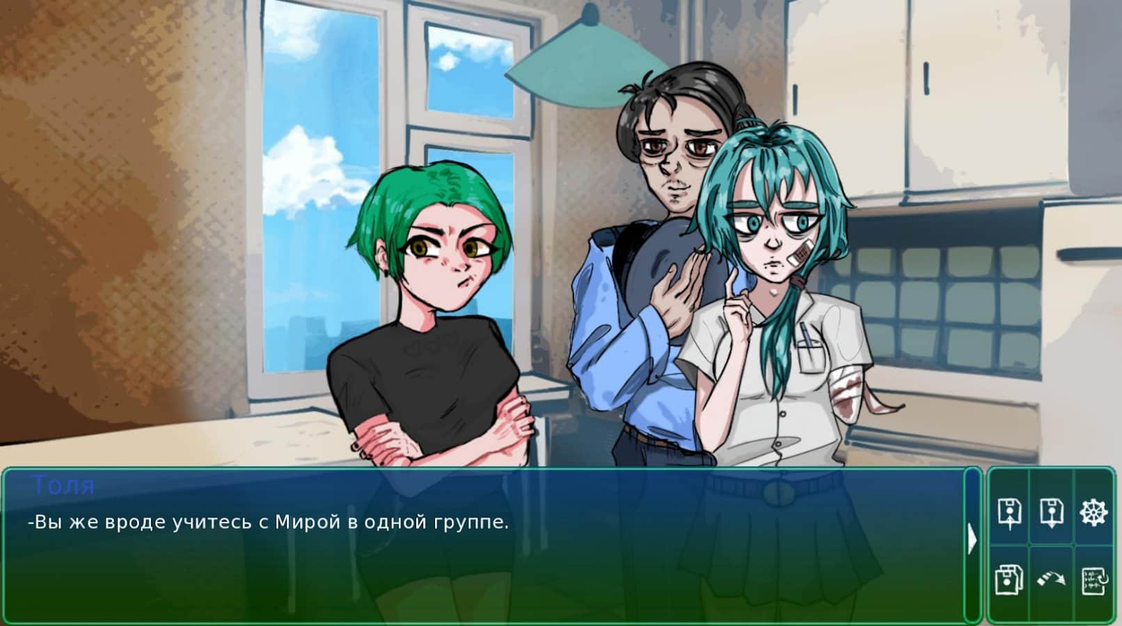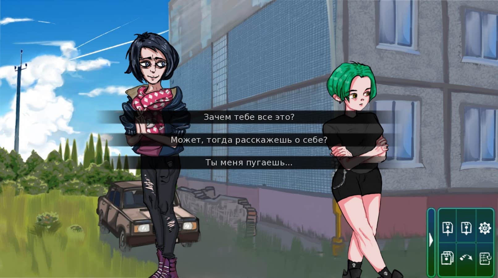 Сюжет. Мира, которая употребляет н@рк_ту (кста в игре прямо о вреде н@рк_ты не говорится, что не очень хорошо), в шарагу не ходит и вообще морально разлагается и прожигает дни, когда её матушка работает как конь, в один день видит однокурсницу без руки. Мире становится жалко девочку и она вместе с ней идёт гулять (всё равно делать нек_й). И если пропустить н@рк_тический бред и можно сказать размышление от том как мира до такого докатилась, то они даже полюбят друг друга. Мне лес_ийс_ие сопли не нравятся, а тем более то, как это все произошло (а произошло это все так, что и писать отзыв игре будет слишком почтительно). Да, в игре есть несколько концовок, но игра такая никакушая, что смотреть другие концовки не охота от слова совсем.