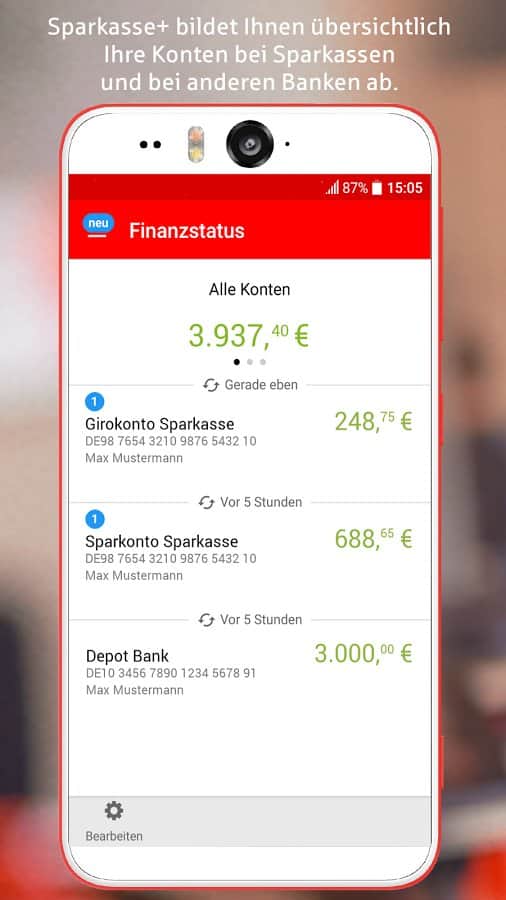 Sparkasse+ - программа для управления финансами на андроид от разработчика Star Finanz GmbH, которая позволит вам держать под контролем: сальдо счета текущих операций, банковских переводов, денежных поступлений и многое другое. Данная программа обеспечивает безопасность передачи данных в соответствии с немецкими принципами для онлайн-банкинга. Так же стоит отметить, что не поддерживаются следующие банки: Commerzbank, TARGOBANK, BMW Банк, Фольксваген Банк, банк Santander, банк Шотландии. К особенностям программы относятся: