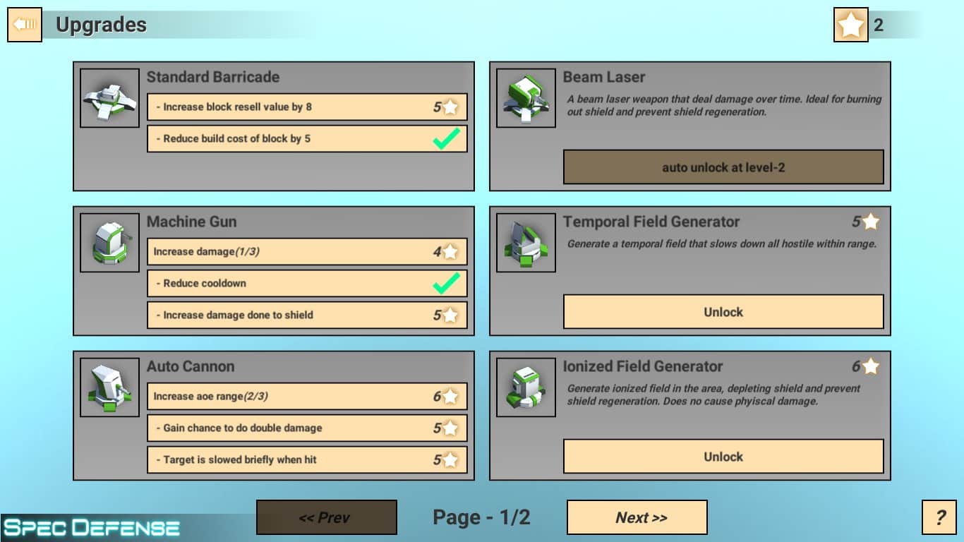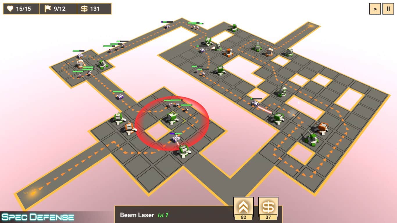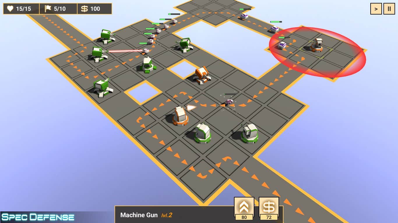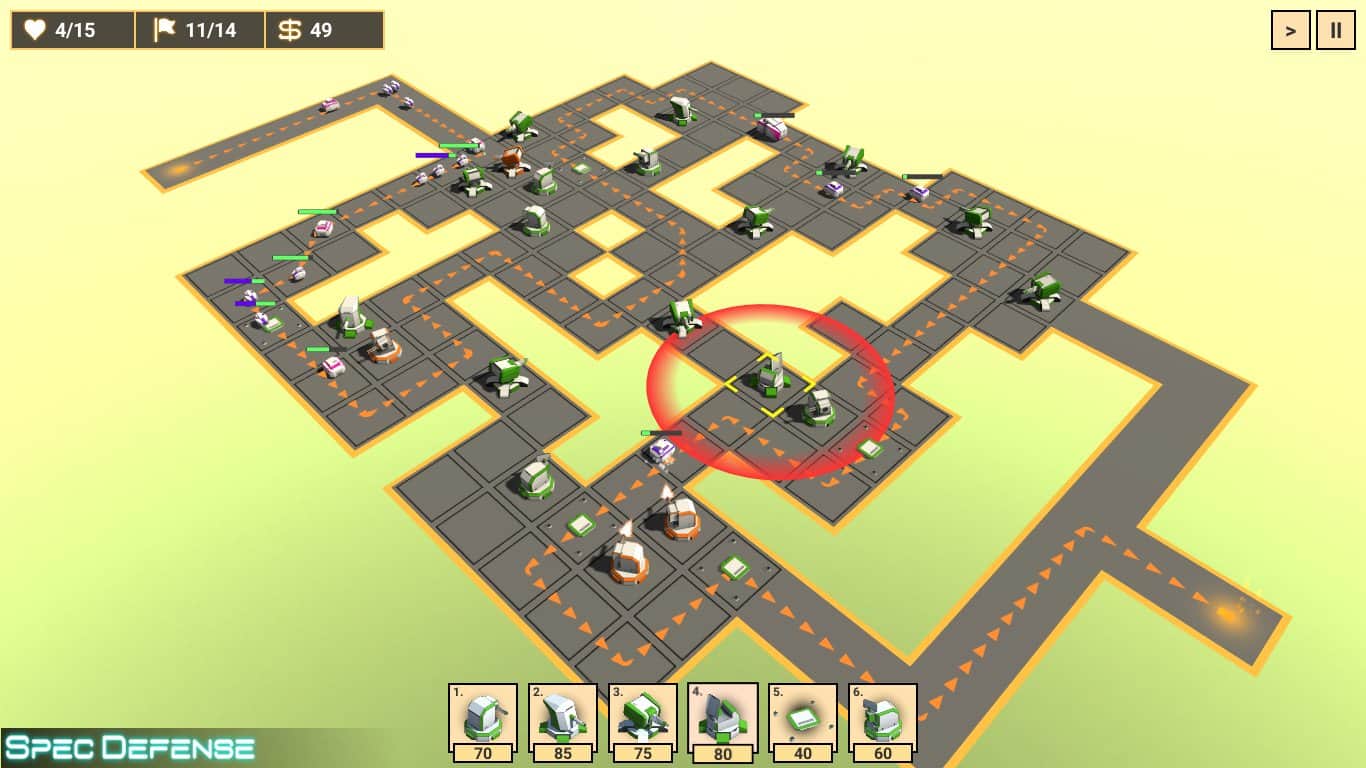 Сможете ли вы пройти все уровни головоломок в увлекательной игре Spec Defense? Главной задачей является ставить башни на платформу, которые могут стрелять пулями и убивать движущихся врагов к финишной точке. Улучшайте их скорость, силу, преграждайте пути, думая куда нужно поставить защищающую башню и создавайте новые, более сильные. Игра разработана на логику и построение стратегий человеком, ведь платформы бывают разные, а значит у них есть свои недостатки. В каждом бою у вас есть ограниченное количество попыток, необходимое количество флагов и деньги.