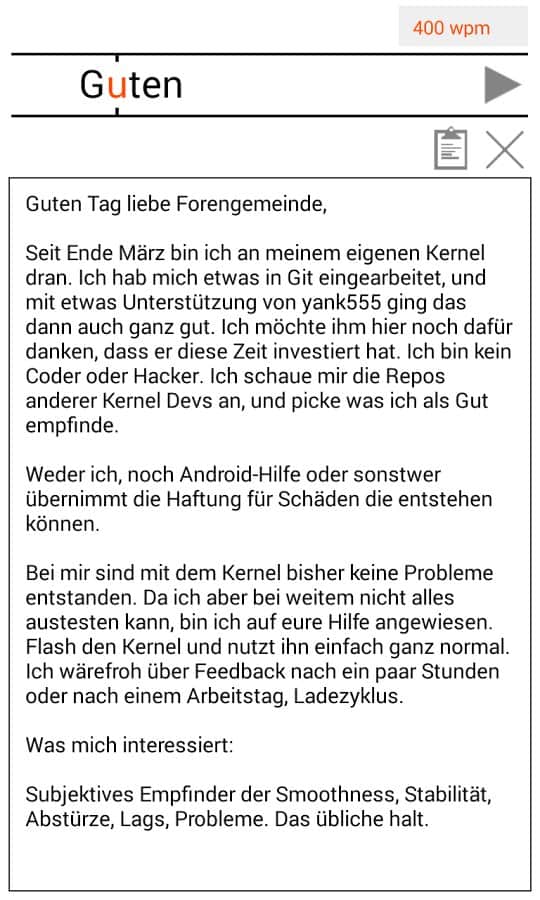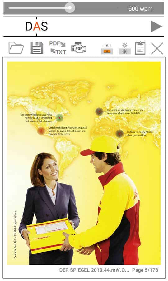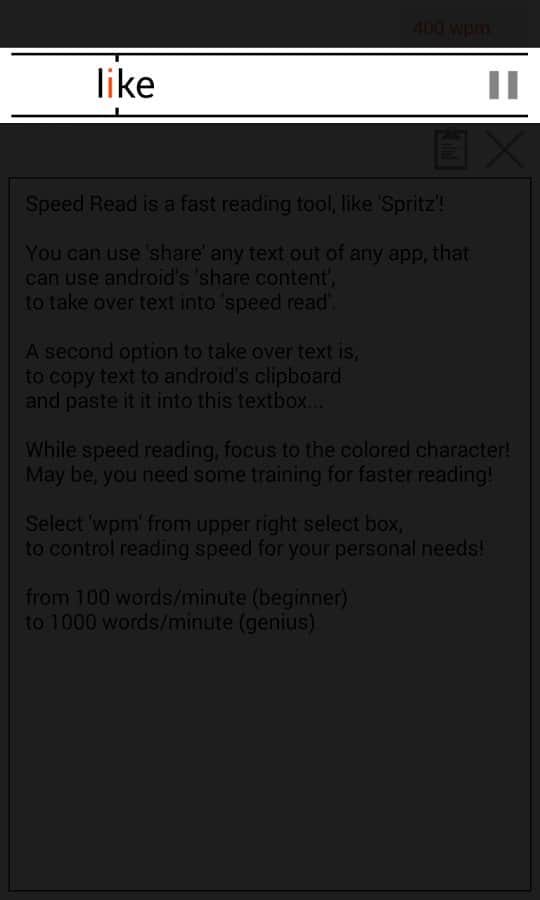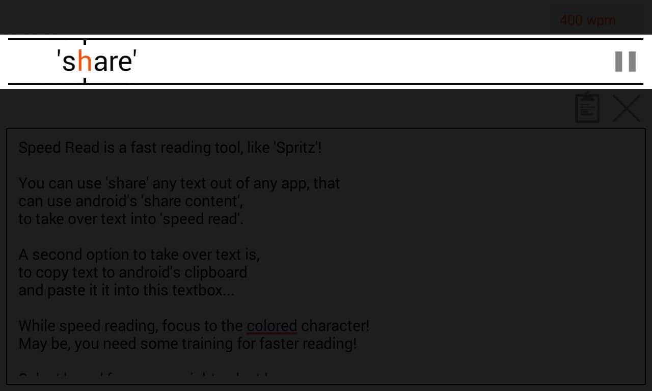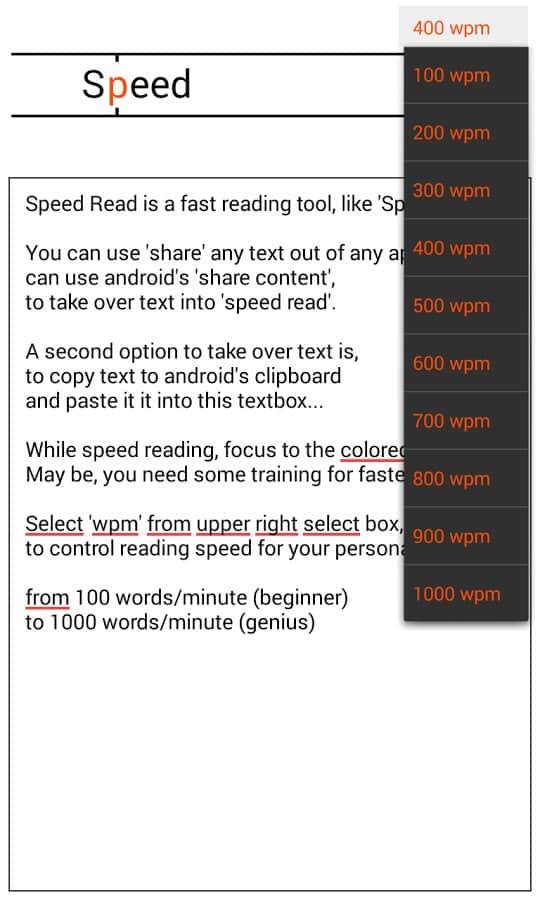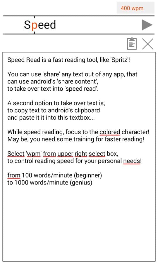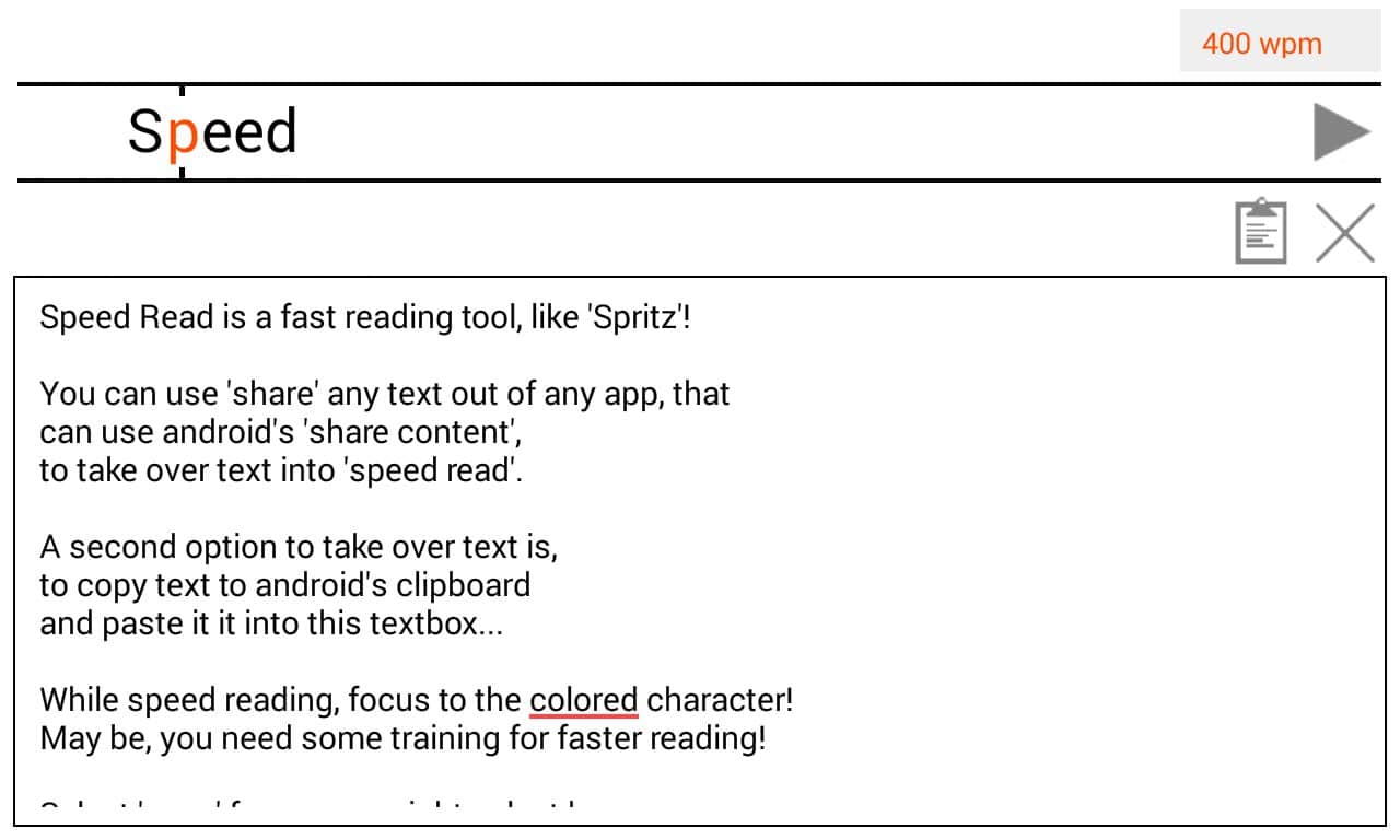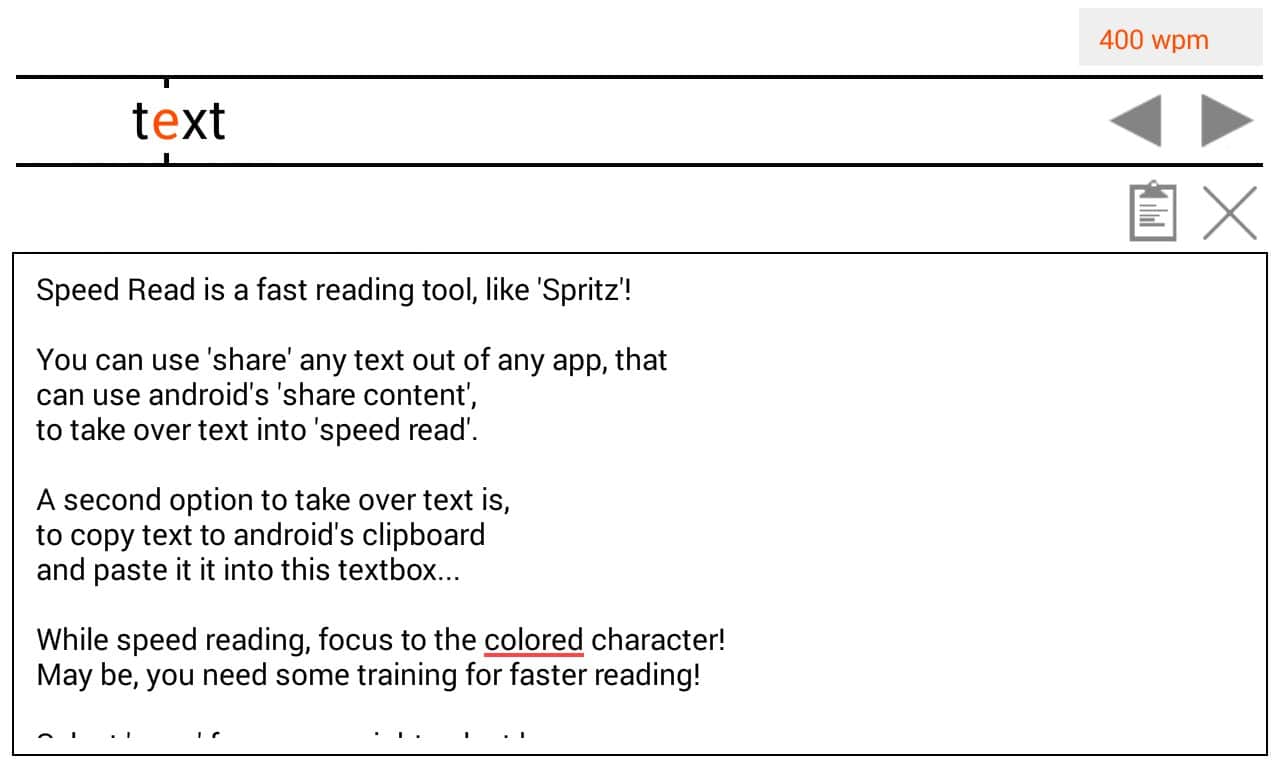 Speed Read inspired by Spritz! – отличное приложение на андроид для любителей быстрого прочтения на своем устройстве различных статей и художественных текстов. Как это работает: область приложения отображает слова по одному в верхней части экрана, а полнотекстовая версия того, что вы читаете оказывается под мигающими словами и подсвечивая каждое слово, отображённое на верху. Приложение содержит массу различных возможностей и особенностей, что в свою очередь не оставит ни одного пользователя Speed Read inspired by Spritz! равнодушным.