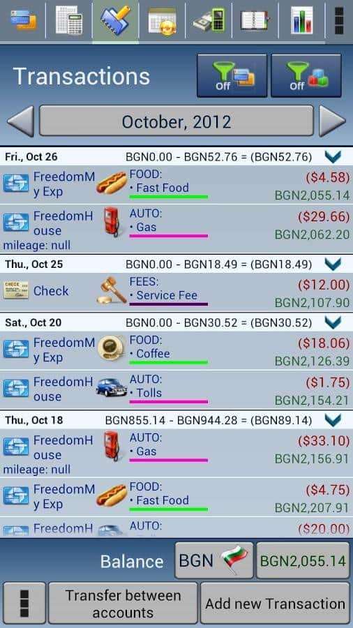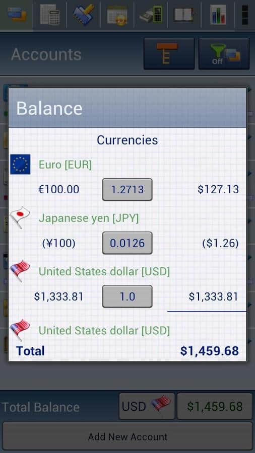 - Безграничное количество Счетов и Подсчетов с поддержкой валют более 30 стран мира и разных типов счетов: банковский счет, наличный счет, кредитная карта, дебетная карта...