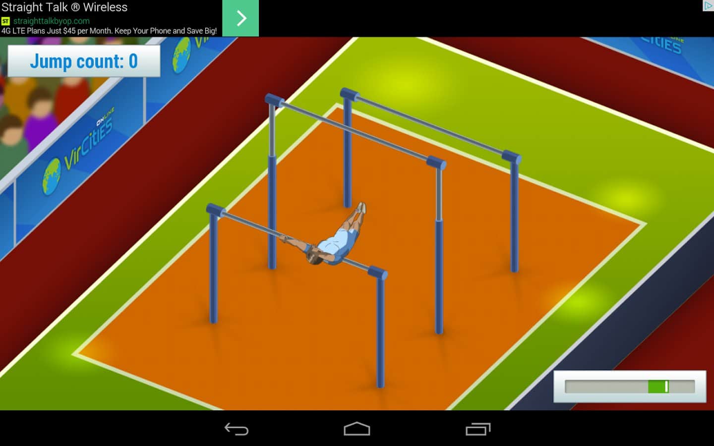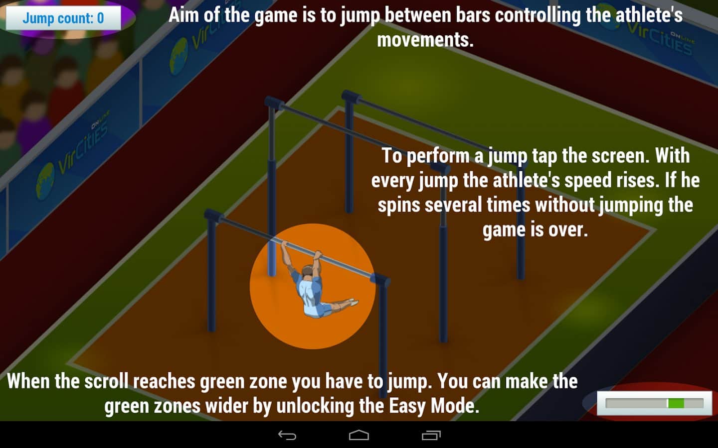 Spin VC - игра, выполненная в стили аркады и сделанная на проверку вашей реакции! Где вам нужно нажать на экран своего девайса именно в тот момент, когда стрелка будет в зелёной зоне. Одно нажатие - один прыжок вашего спортсмена, игра заканчивается именно тогда, когда вы промахнетесь или же слишком долго думаете. Соревнуйтесь со своими друзьями и узнаете у кого лучшая реакция. Если же вы сможете выполнить больше 50 прыжков, то у вас реакция как у пилота истребителя!