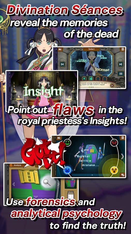 Spirit of Justice – захватывающая игра на андроид, где вы будете играть роль адвоката Феникса Райта. В этой игре вы погрузитесь в мир тайн и загадок где будете выступать на страже справедливости. Наш герой прибывает в здание суда, где будет слушаться дело его подопечного и обнаруживает что главным свидетелем обвинения королевства выступает принцесса-медиум, которая с помощью древнего артефакта показывает что видит перед смертью жертва. Нашему герою предстоит собрать множество улик и доказательств не виновности своего героя, а это добавит больше интриг и вовлечет в расследование больше подозреваемых. Игра наполнена загадками и тайнами, а также она порадует вас искрометным юмором и многочисленными героями.
