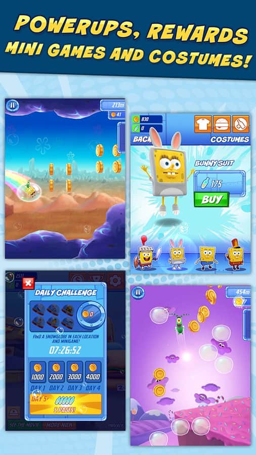 SpongeBob: Sponge on the Run - раннер на андроид, который основанный на новом фильме который выйдет в большой прокат в феврале. В этой игре вы вместе с Спанч Бобом и планктоном отправитесь на поиски утерянной формулы приготовления Krabby Patty. Садитесь в машину времени и отправляйтесь на песчаный пляж, где вас ждут разнообразные препятствия и бонусы. Бегайте, прыгайте и пролезайте под большими препятствиями, а также не забывайте собирать монетки и бонусы которые помогут вам превратиться в супер Спанч Боба который будет крушить все на своем пути и бежать вперед к своей цели. Играйте и получайте удовольствие от разнообразных миров, в которые вас перенесет машина времени.
